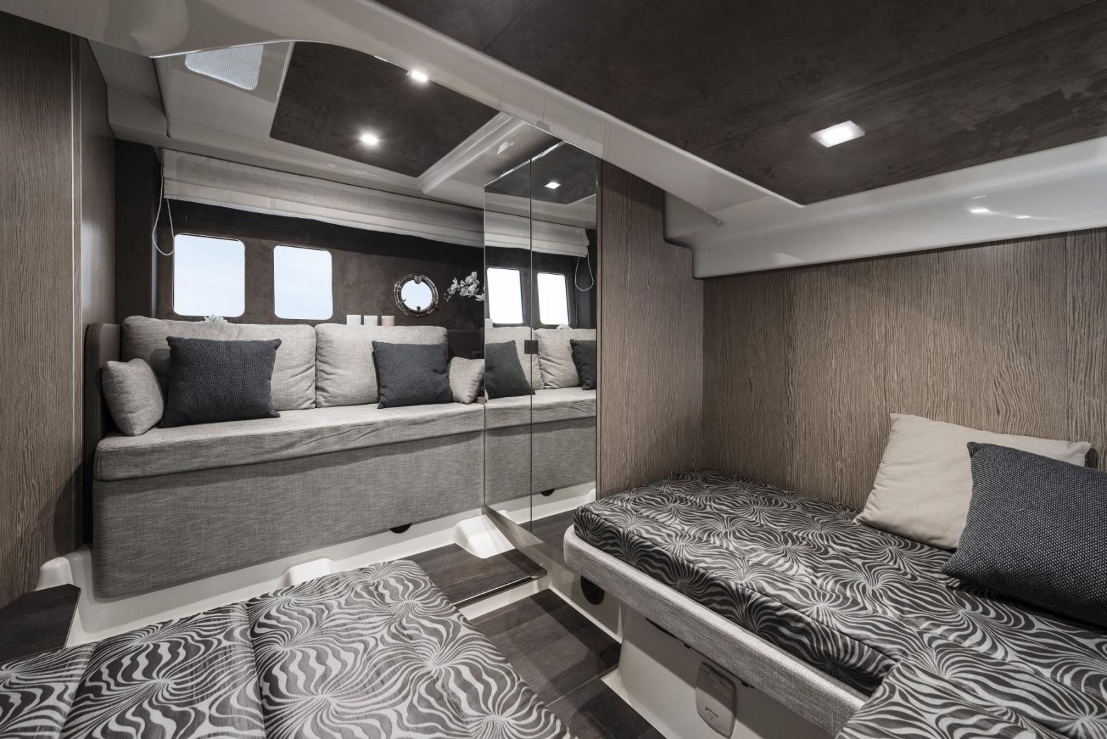 cushion), saloon table convertible into bed, platform teak covering, remote control winch with
