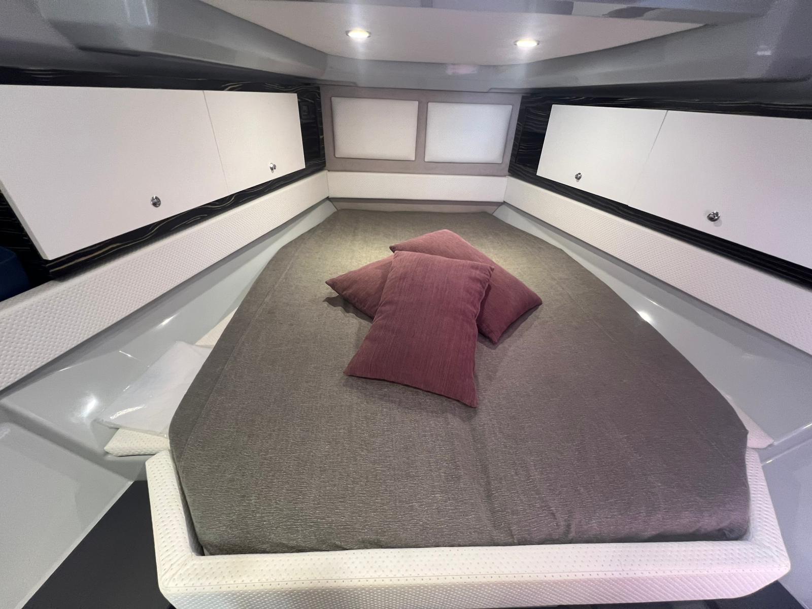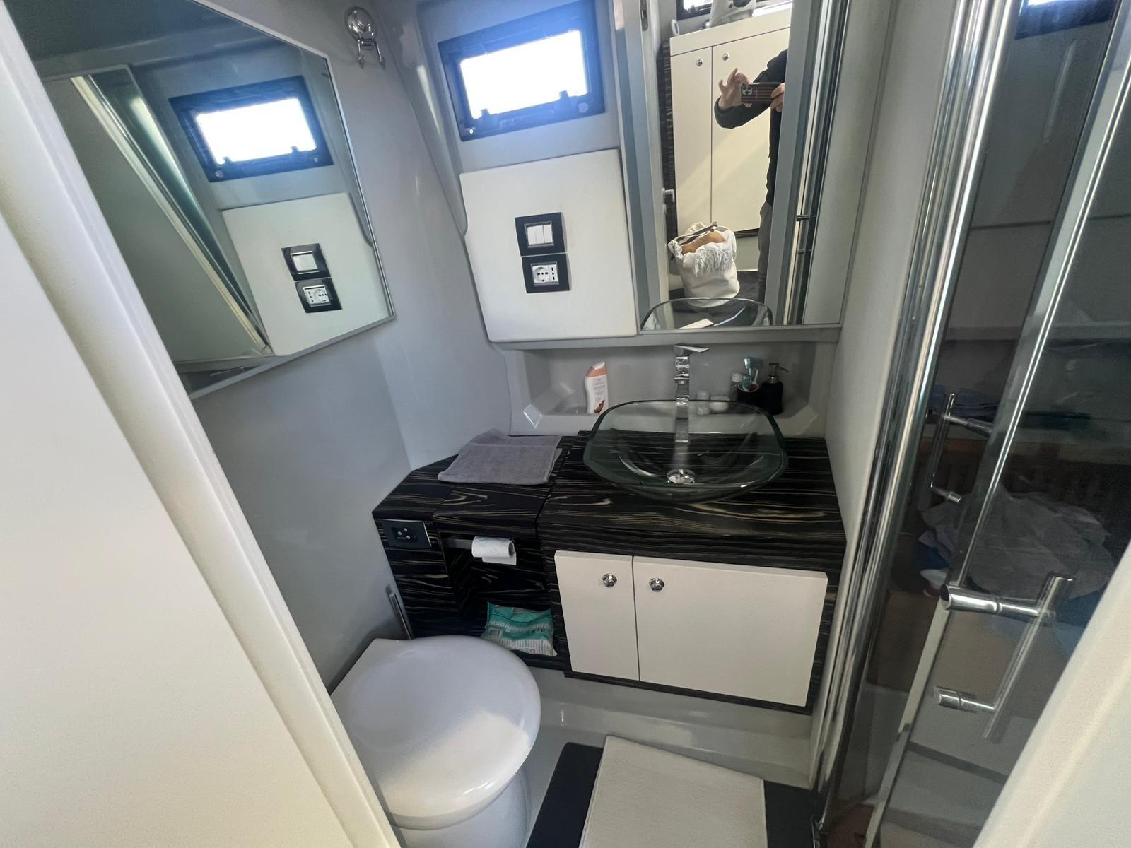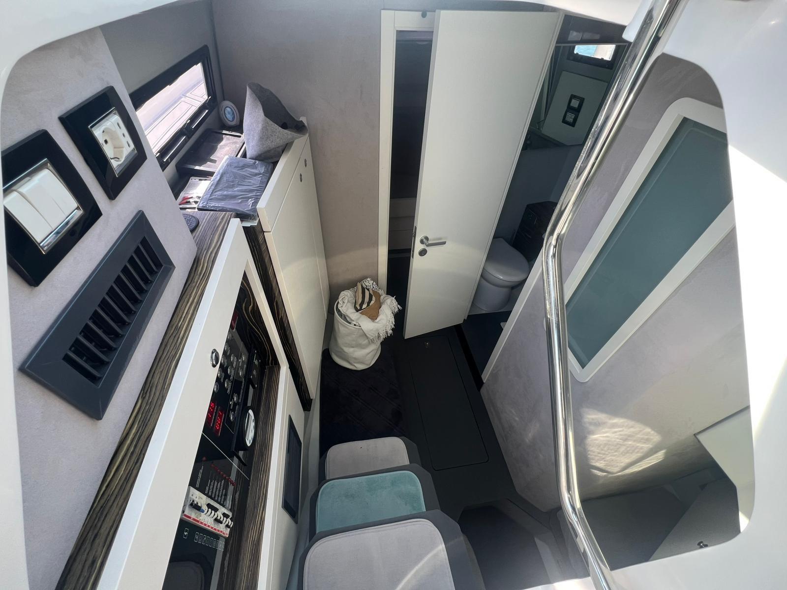 2 Deck Shower, Bow Thruster (JET THRUSTER HOLLAND MARINE), Washbasin in the cockpit, Underwater lights, Gangway (in carbonio), Shorepower connector, Electric Windlass, swimming ladder, cockpit table, T-Top.