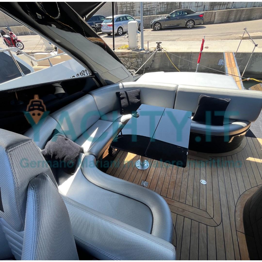 Water pressure pump, Shore power cable, Special Colour, Deck Shower, Electric Flaps, Tender Garage (completo di verricello e compressore per gommone), Fire Extinguishing System, Anchor Chain Washdown, Washbasin in the cockpit, Courtesy Lights, Outboard engine for tender (Mercury 3.5), Gangway (idraulica), Platform (con teak), Automatic Bilge Pump, Manual Bilge Pump, Teak Cockpit, Shorepower connector, Rollbar, Electric Windlass, swimming ladder, cockpit table, Tender, Horn.