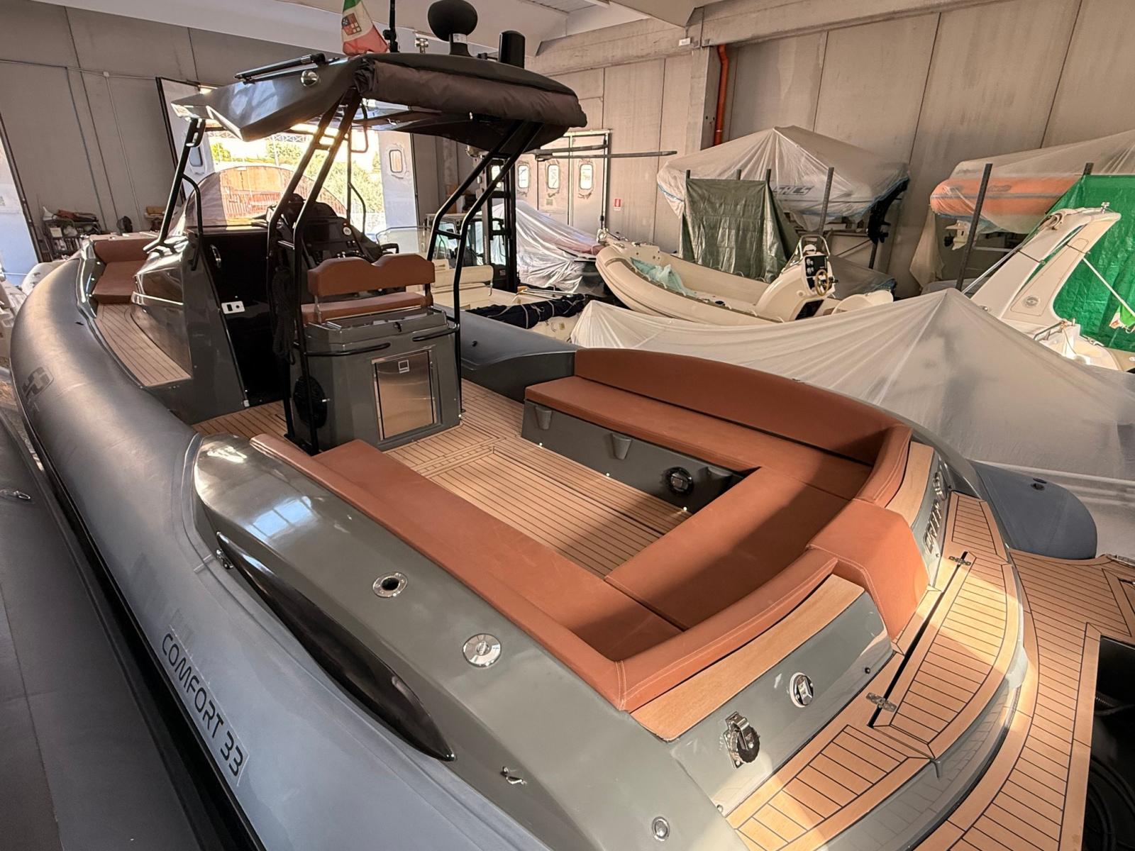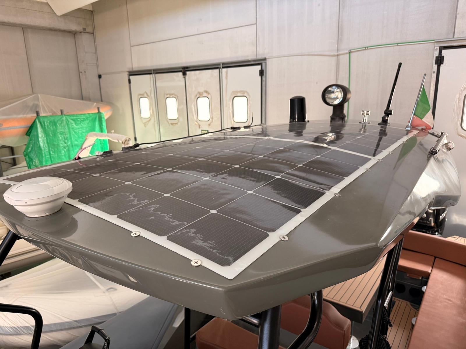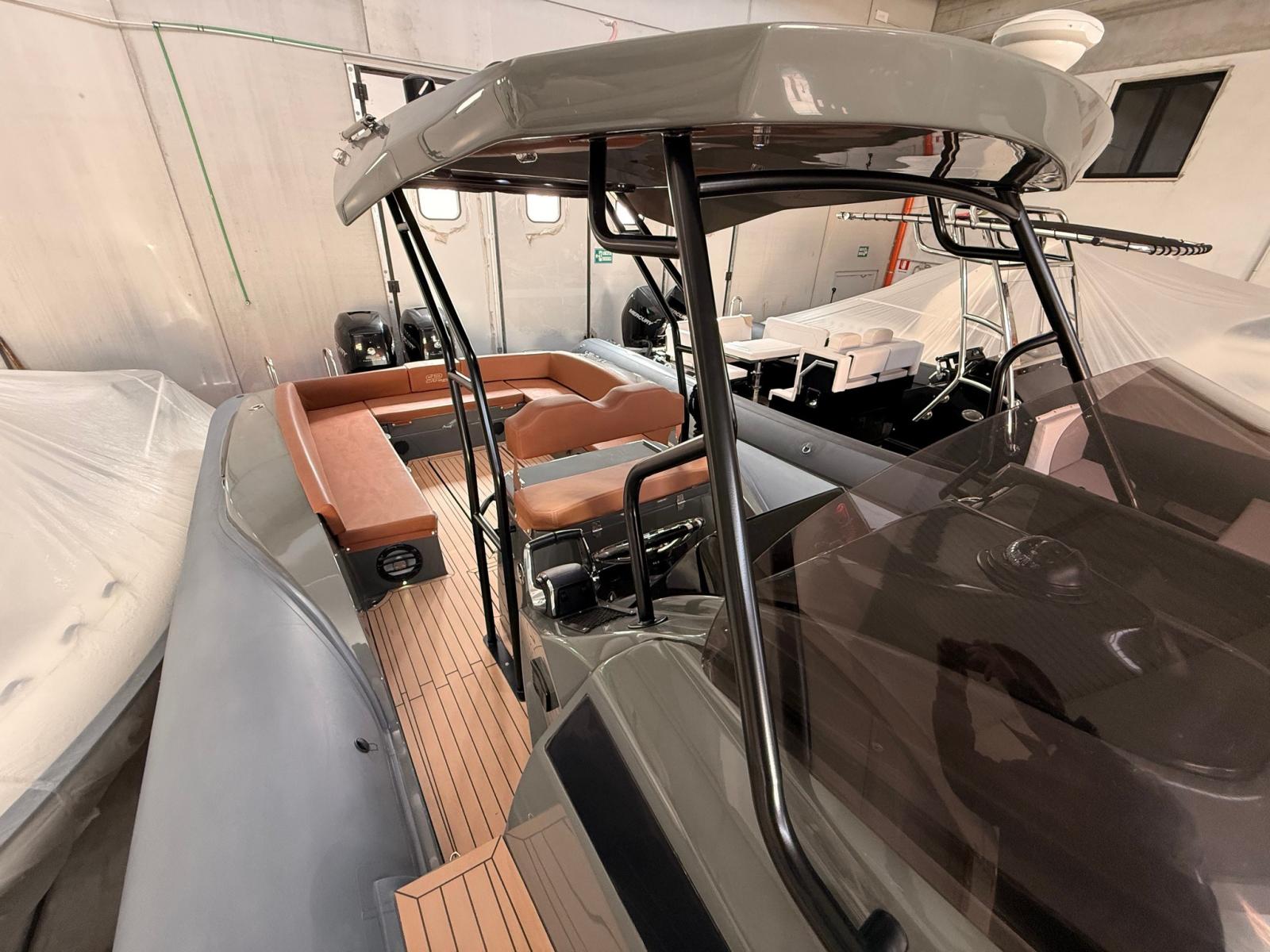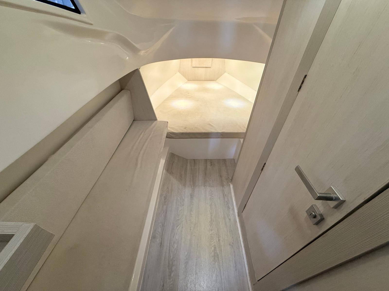 Anchor (10 KG), Water pressure pump, Batteries (3 (2 x 100 Ah servizi - 1 x180 Ah MOTORE)), Teak Side Decks (CHIMTEAK), Shore power cable, 3 Deck Shower, Tow hook for water skiing, Anchor Chain Washdown, Washbasin in the cockpit, Courtesy Lights (LED RGB), Underwater lights, Fenders, Teak Cockpit (CHIMTEAK), Shorepower connector, Electric Windlass, 2 swimming ladder, cockpit table (ELETTRICO), Horn, Teak Deckhouse (CHIMTEAK).