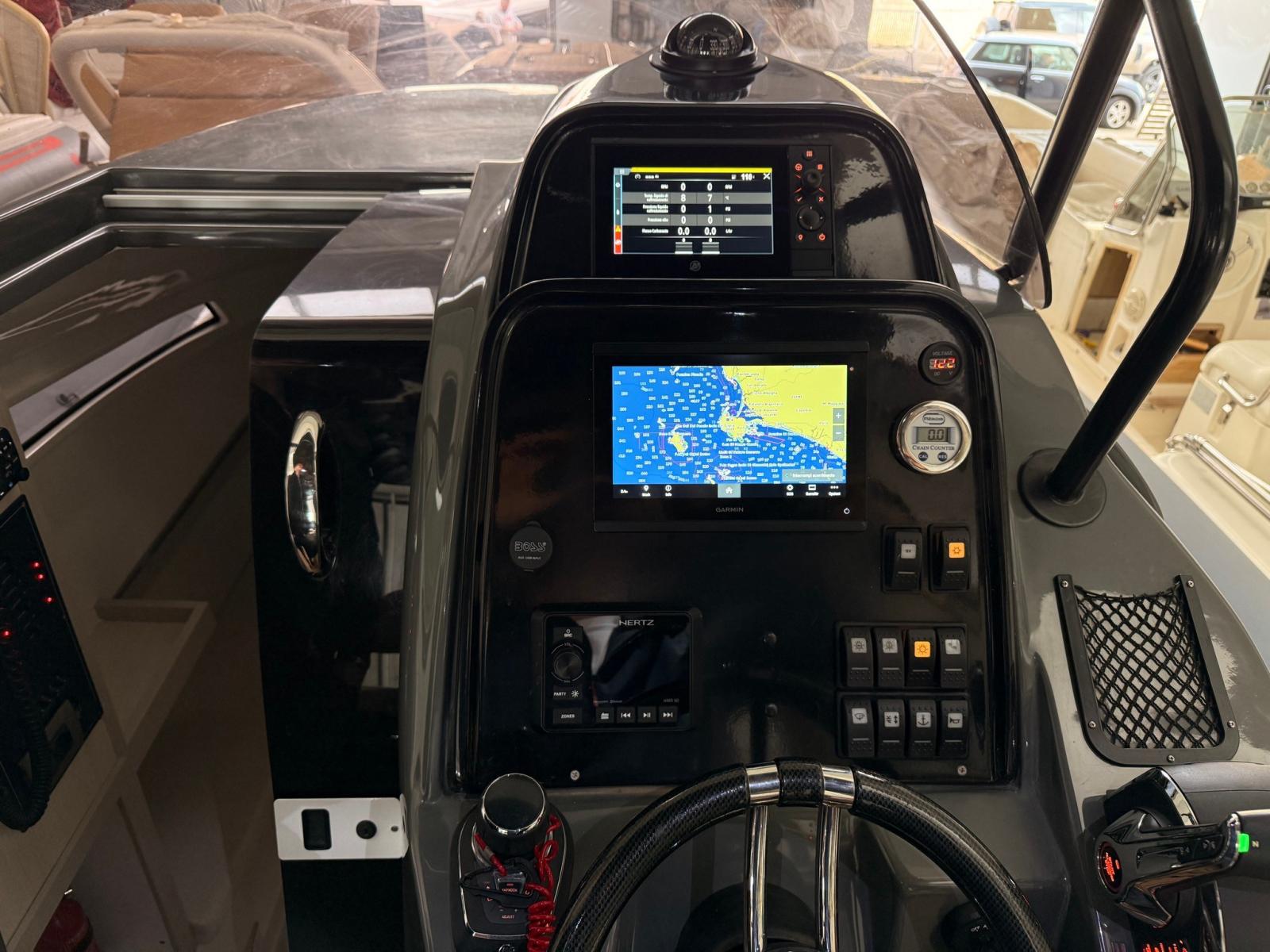 On-Board Computer (MERCURY), Chain counter (MZ ELECTRONIC), Depth Sounder (GARMIN), GPS (GARMIN 923XSV), Joystick (MERCURY + SKYHOOK), Consumption monitor (MERCURY), Plotter with GPS antenna, VHF Radio (ICOM IG-M423GE).