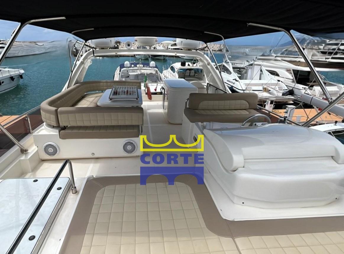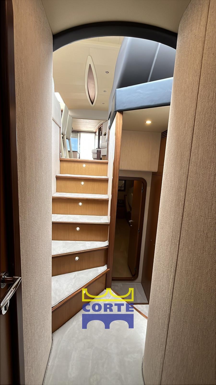 Fume/Gas Detector, Engine Alarm, Bilge Alarm, Water pressure pump, Shore power cable, Deck Shower, Twin Steering, Directional Spotlight, Hydraulic Flaps, Tender Crane (passerella), Fire Extinguishing System, Flaps Indicators, Anchor Chain Washdown, Washbasin in the cockpit, Courtesy Lights, Battery Monitor, Gangway (elettroidraulica), Platform (poppa in teak con gavone ad apertura elettrica), Waste Water Tank Drain Pump, Automatic Bilge Pump, Manual Bilge Pump, Teak deck, Entry door, Side door, Teak Cockpit, Shorepower connector, Water harbor connector system, Electronic instrumentation repeater, Rollbar, Electric Windlass, swimming ladder, cockpit table, Horn, 2 Stern Winches, Bow Winches.