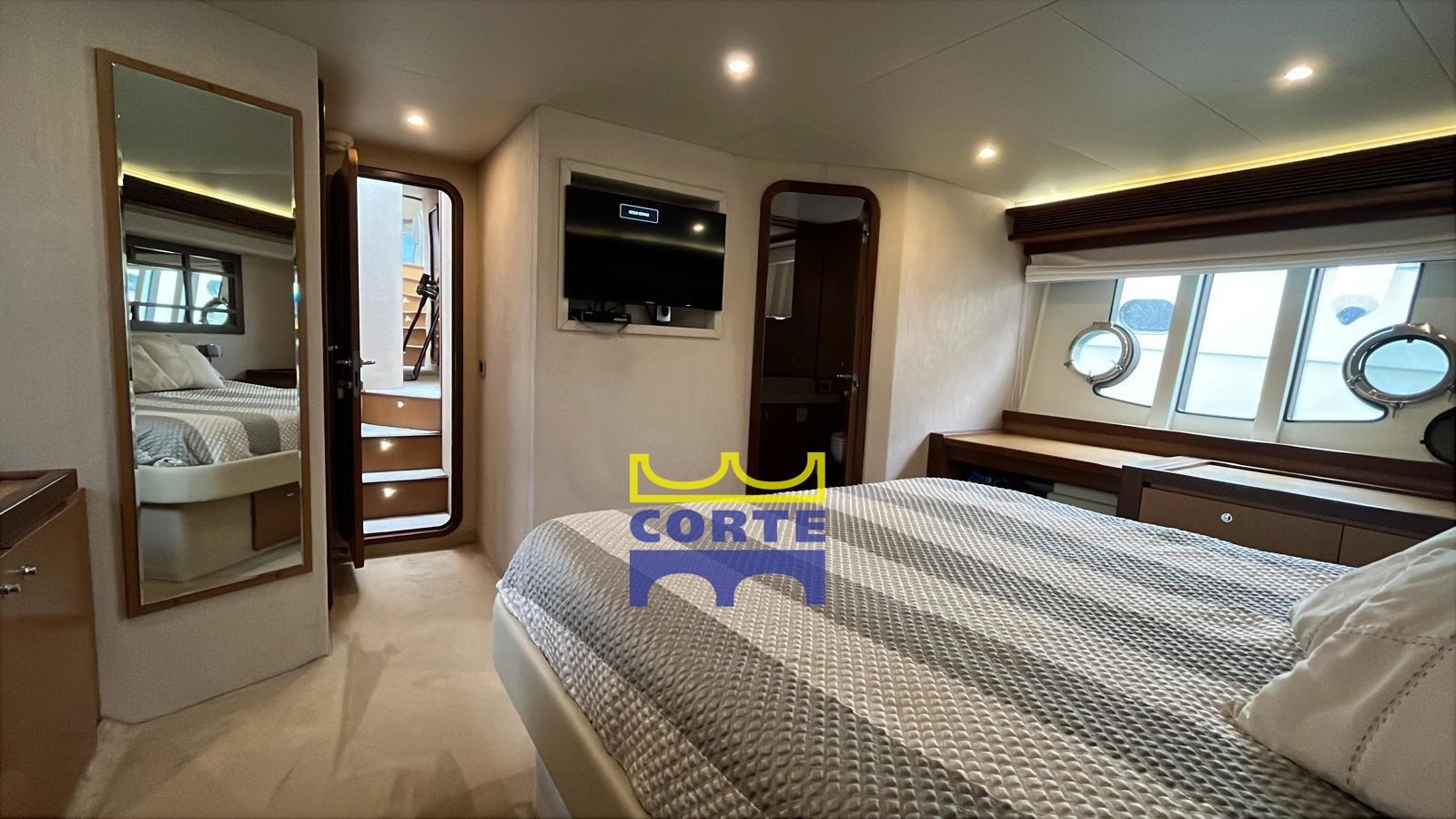 The owner's cabin is equipped with a large wardrobe and a large bathroom with separate shower with teak flooring. Upon entering, the feeling of space is remarkable and encouraged by the great brightness offered by the open-view windows on both sides, with portholes that can be opened to allow the cabin to be ventilated