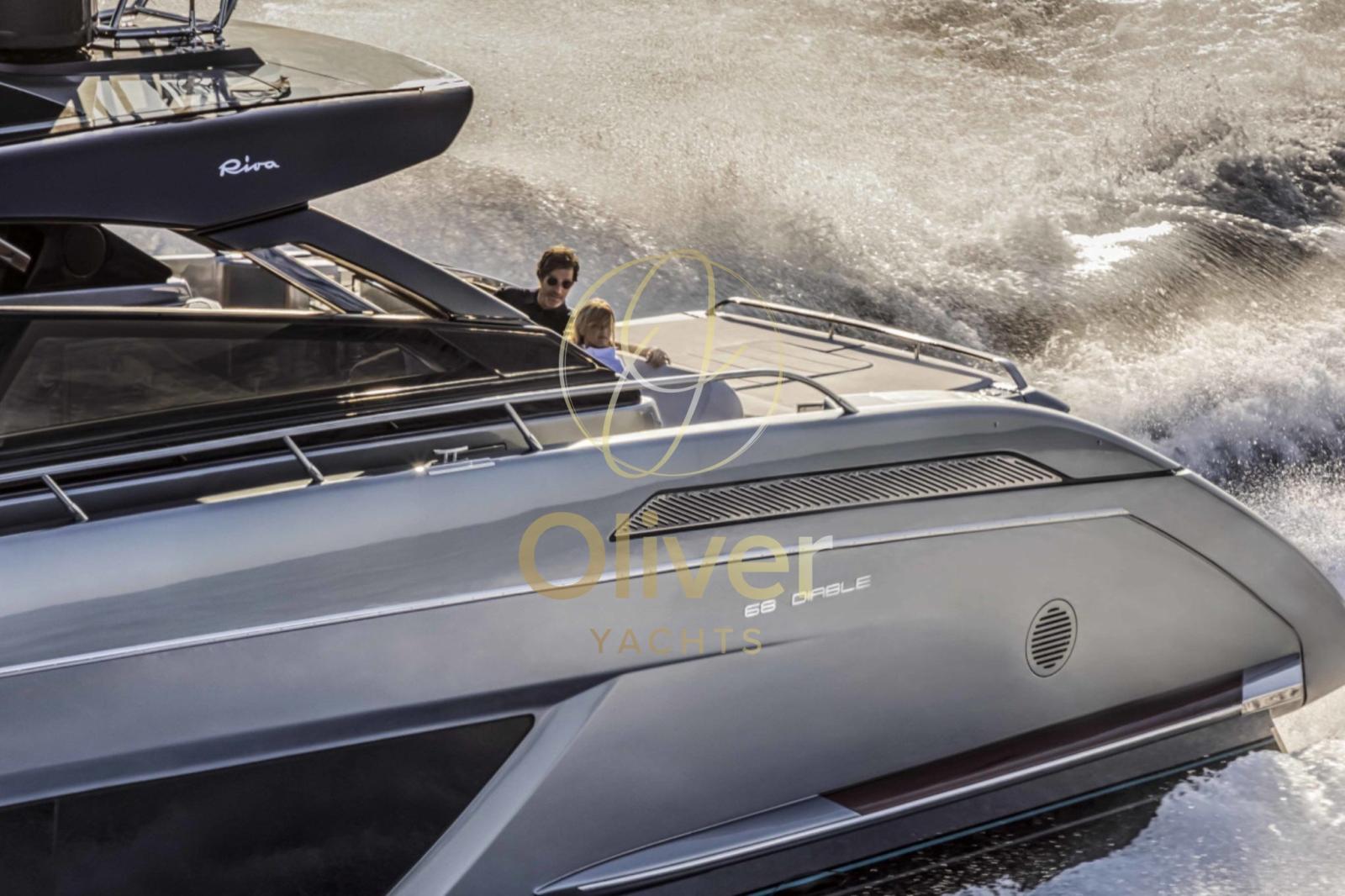 This Riva 68' Diable is a latest-generation sports open yacht that interprets the concept of a day cruiser yacht in a contemporary key. The lines are taut but harmonious, with a sleek profile that expresses performance without sacrificing the elegance typical of the brand. The deck is organized in a rational way: large sunbathing area in the bow, convivial cockpit with dinette and wet bar, safe and well-sized walkways.