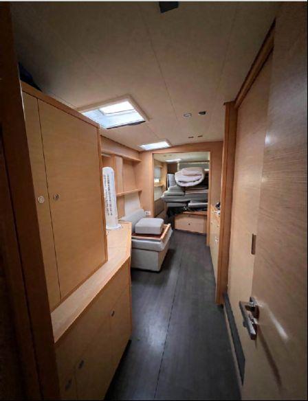 The panoramic saloon is bright and welcoming, featuring a retractable TV (2022), Fusion sound system (2022), integrated safe and a rare L-shaped galley with central island. Equipment includes electric oven, induction cooktop, double refrigerator (one added 2022), double drawer freezer (2022), Miele dishwasher, Miele washing machine, ice maker (2022), Nespresso machine and Sodastream.