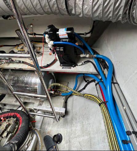 Full Raymarine electronics package including radar, autopilot, wind/speed/depth instruments and dual chartplotters (interior & flybridge – 2022). Aquamatic watermaker (628 hours), generator, shore power and 2000W/3000W inverters complete the onboard systems.