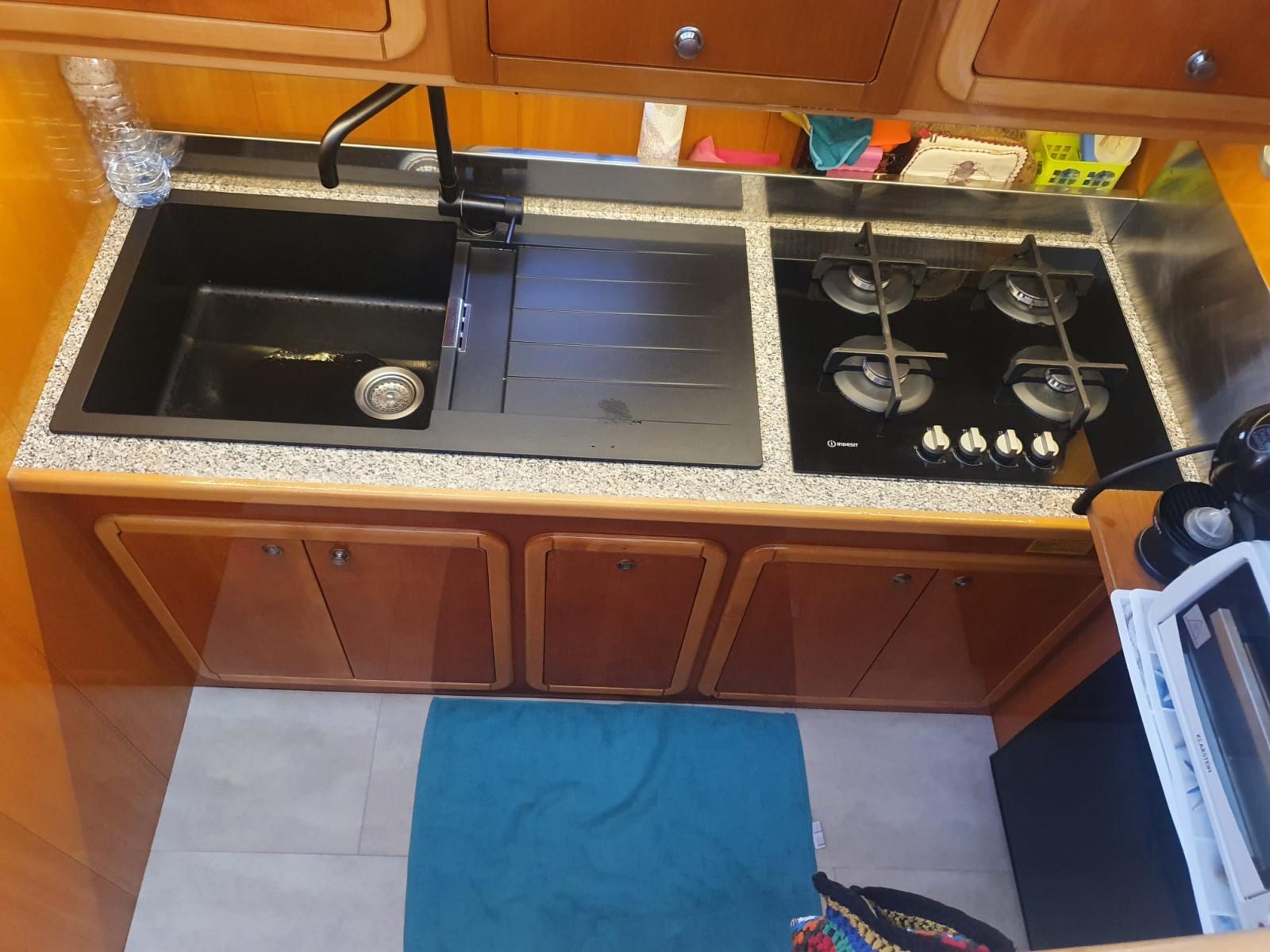 Galley, Burner (4 fuochi), 2 Refrigerator (130 l in cucina + 75 nel salone), Electric hot plate.