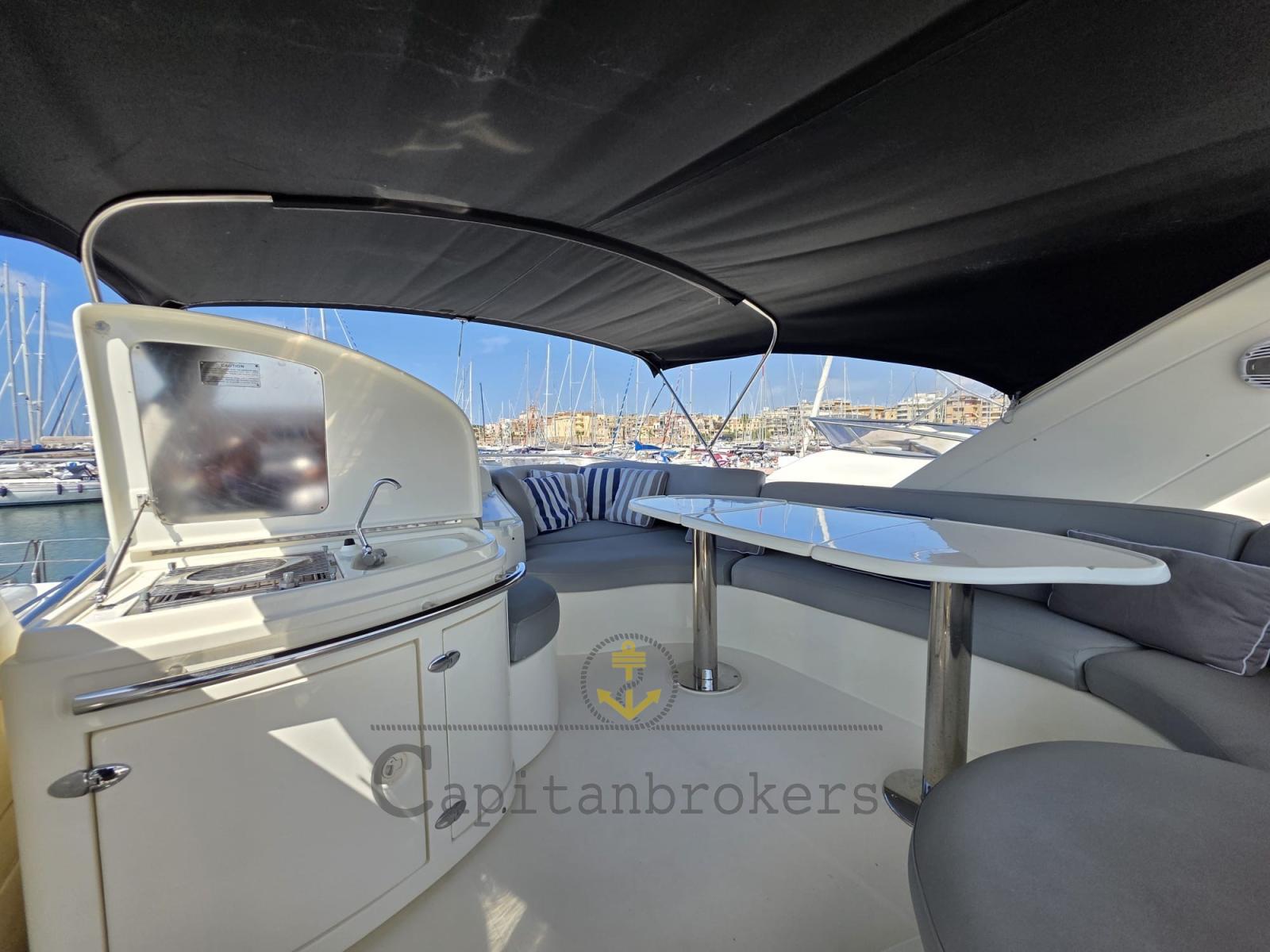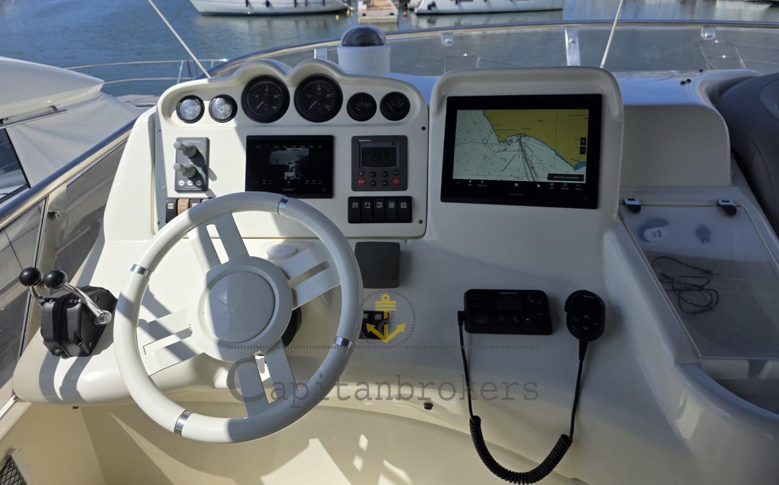 Engine Alarm, Bilge Alarm, Water pressure pump, 8 Batteries, Deck Shower, Twin Steering, Fire Extinguishing System, Flaps Indicators, Washbasin in the cockpit, Courtesy Lights, Underwater lights, Gangway, Platform (in teak), Automatic Bilge Pump, Manual Bilge Pump, Entry door, Teak Cockpit, Shorepower connector, Water harbor connector system, Electric Windlass, swimming ladder, cockpit table (in teak), Horn.