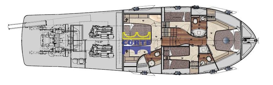 Fume/Gas Detector, Engine Alarm, Bilge Alarm, Anchor (Bruce 40 kg in acciaio inox con 100 n di catena), Spare shaft, Water pressure pump, Deck Shower (con miscelatore c/f), Bow Thruster (Vetus), Directional Spotlight, Tender Garage, Fire Extinguishing System, Washbasin in the cockpit, Courtesy Lights, Gangway (idraulica a scomparsa Besenzoni), Platform (da bagno idraulica rivestita in teak), Automatic Bilge Pump, Entry door (salone in acciaio con cristallo), Teak Cockpit, Shorepower connector, Water harbor connector system, Electric Windlass, swimming ladder (manuale), Stabilizers (Seakeeper), cockpit table, Horn, 2 Stern Winches, Bow Winches.