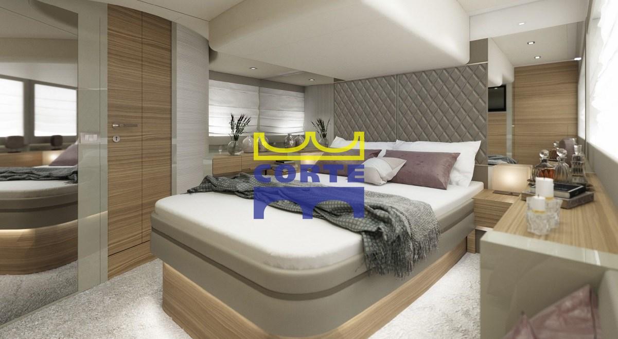 Double master cabin amidships with wood and leather finishes, carpeted floor.
