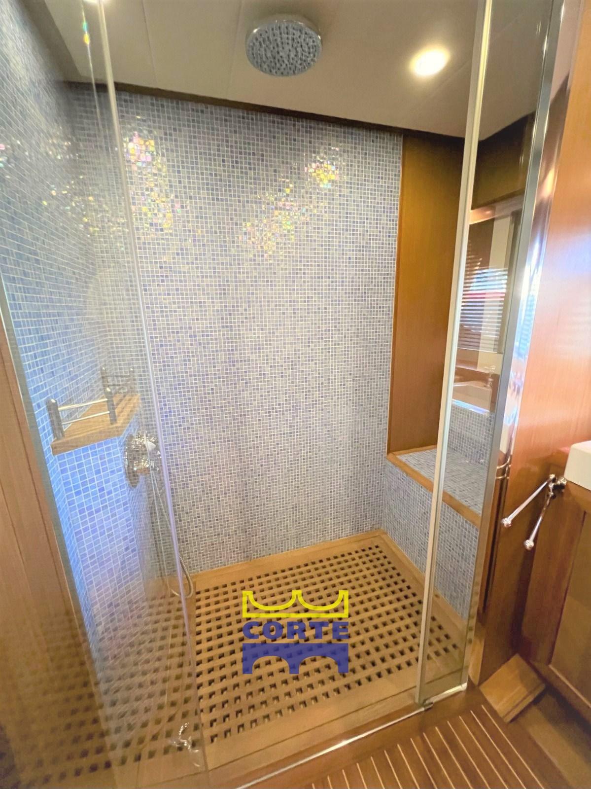 Engine Alarm, Bilge Alarm, Anchor (Bruce inox), Water pressure pump, Teak Side Decks, Special Colour (azzurro), Deck Shower, Twin Steering, Directional Spotlight, Hydraulic Flaps, Tender Garage (ad apertura elettroidraulica), Fire Extinguishing System, Washbasin in the cockpit, Courtesy Lights, Underwater lights (sotto plancetta di poppa), Gangway (elettroidraulica a scomparsa), Platform (poppa per bagno), Automatic Bilge Pump, Entry door, Teak Cockpit, Shorepower connector, Water harbor connector system, Electronic instrumentation repeater, Electric Windlass, swimming ladder, Stabilizers (Arg Mitsubishi), cockpit table (con 2 divani), Tender (recente con alaggio facilitato), Horn, Winch Electric (prua), 2 Stern Winches, Bow Winches.