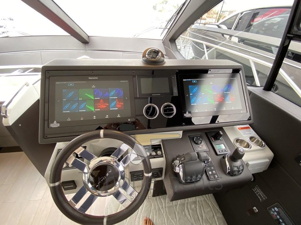 AIS, Rudder angle indicator, Radar Antenna, 3 Electronic engine control, On-Board Computer, Chain counter, Display, DSC vhf, 3 Joystick, Co-pilot seat.