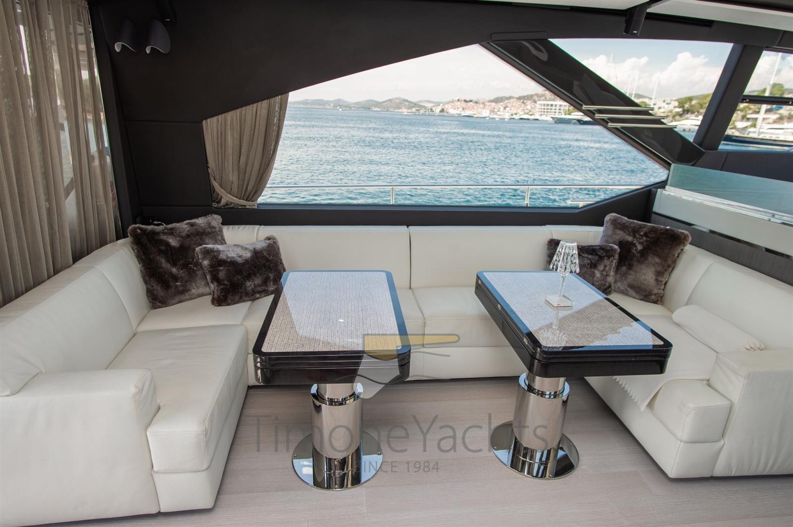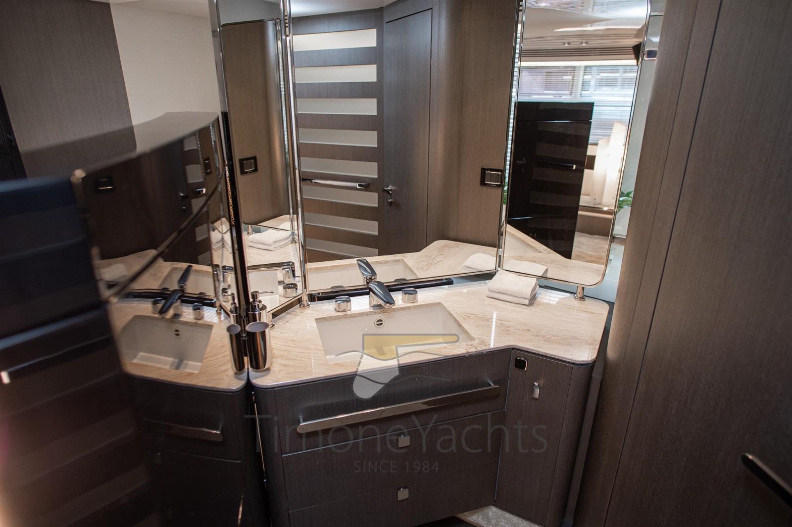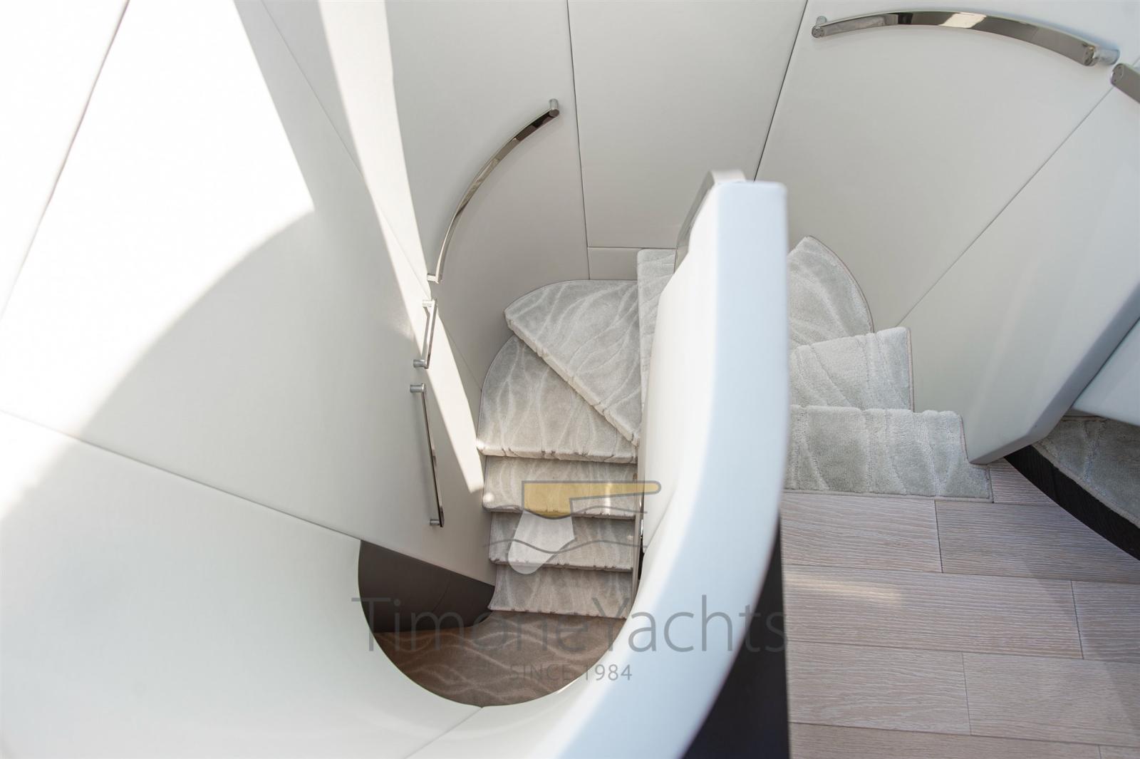 Auto-Trim, Teak Side Decks, Deck Shower, Headlights fixed on the stem, Directional Spotlight, Electric Flaps, Tender Garage, Hard top, Fire Extinguishing System, Flaps Indicators, Anchor Chain Washdown, Courtesy Lights, Underwater lights, Gangway, Teak Cockpit, Shorepower connector, Water harbor connector system, Stabilizers (Seakeeper NG 16), cockpit table, Horn, 2 Stern Winches, Bow Winches.
