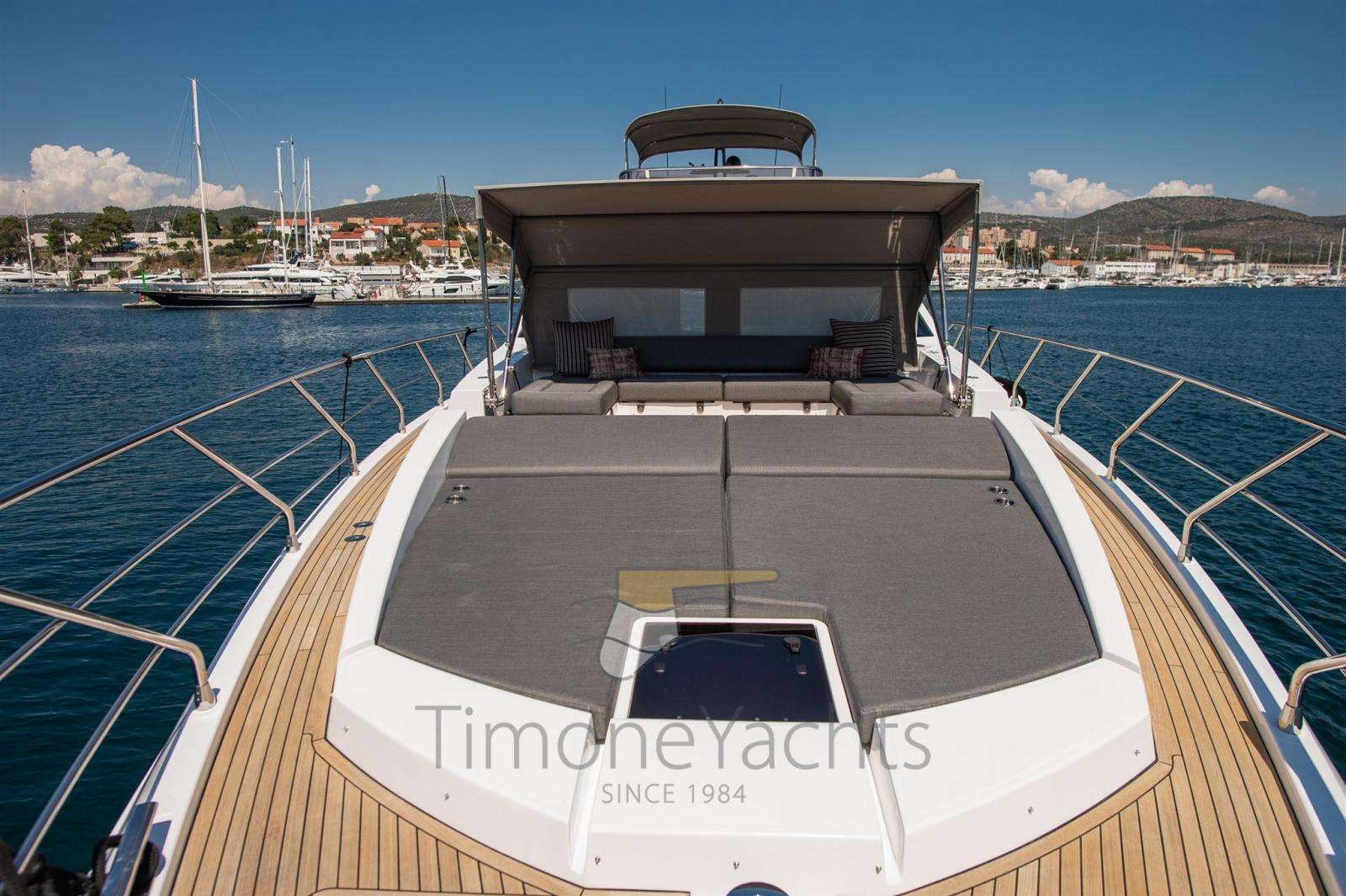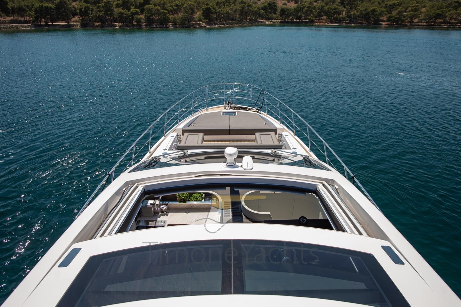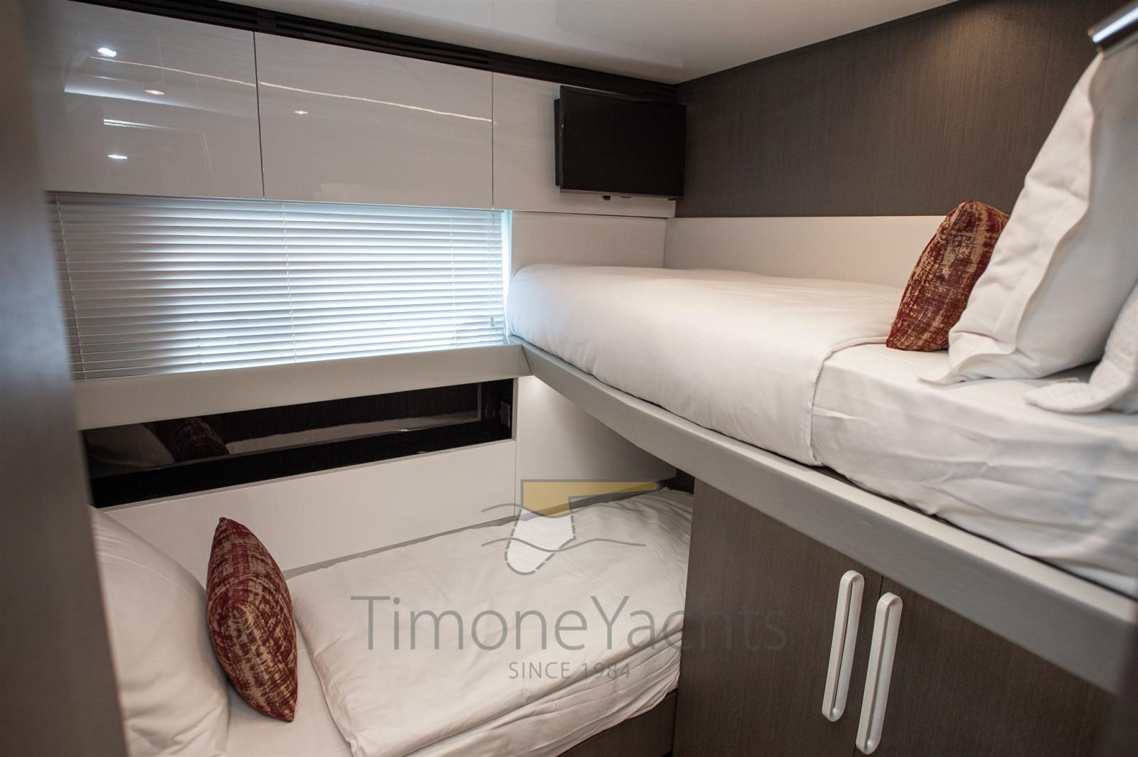 Auto-Trim, Teak Side Decks, Deck Shower, Headlights fixed on the stem, Directional Spotlight, Electric Flaps, Tender Garage, Hard top, Fire Extinguishing System, Flaps Indicators, Anchor Chain Washdown, Courtesy Lights, Underwater lights, Gangway, Teak Cockpit, Shorepower connector, Water harbor connector system, Stabilizers (Seakeeper NG 16), cockpit table, Horn, 2 Stern Winches, Bow Winches.