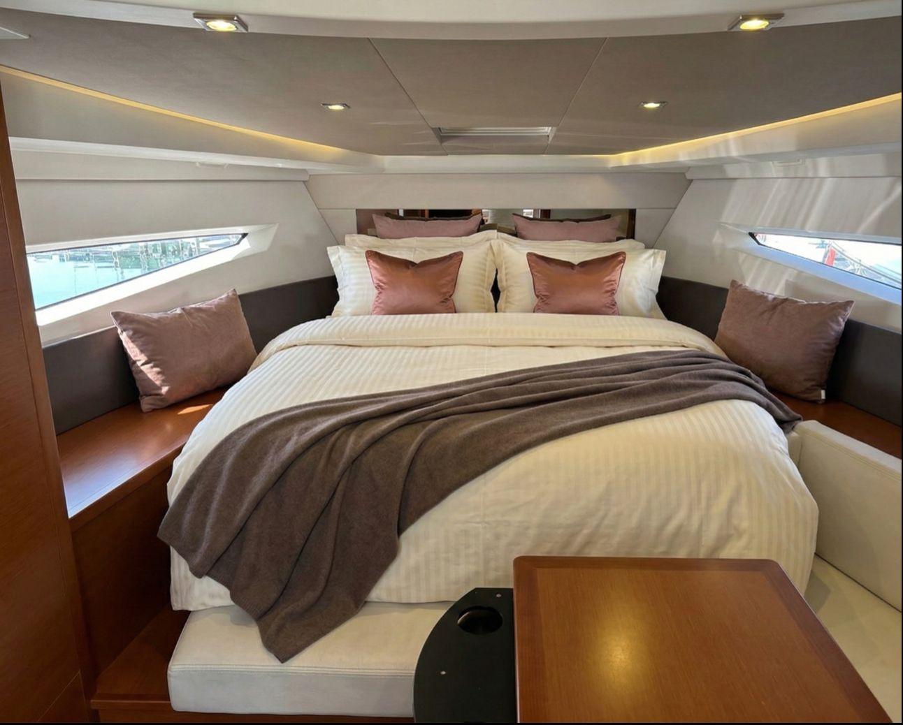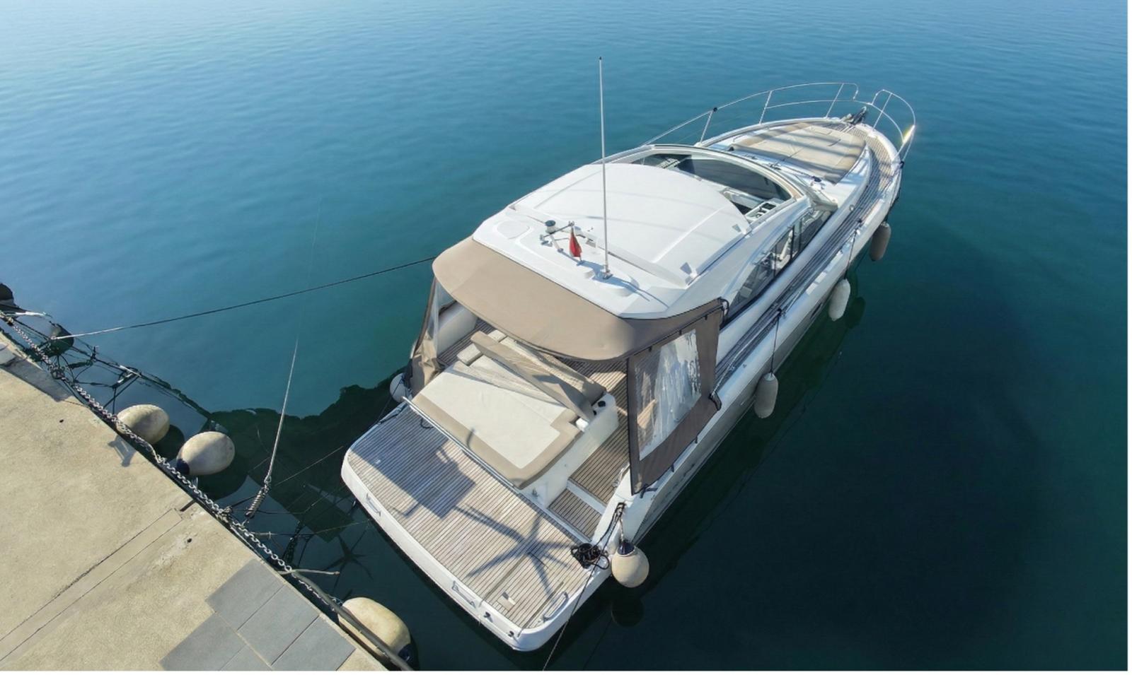 The spacious teak cockpit, electric hardtop, large forward and aft sunbeds, and generous swim platform make it an ideal boat for both family cruising and day trips.