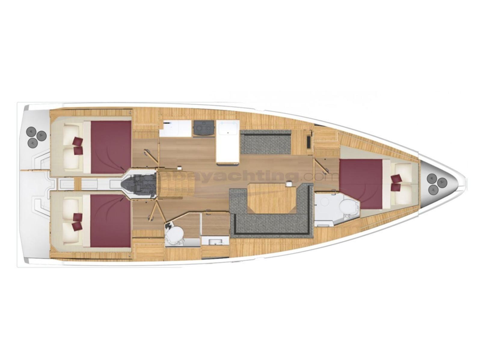 Used Bavaria C38. Layout: 3 cabins and 2 bathrooms + convertible dinette.