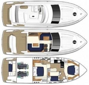 salon, galley, dinette, 2 x bathroom, cockpit, flybridge