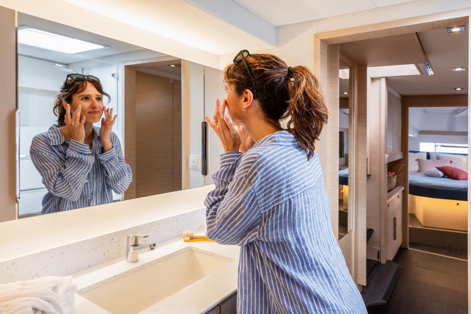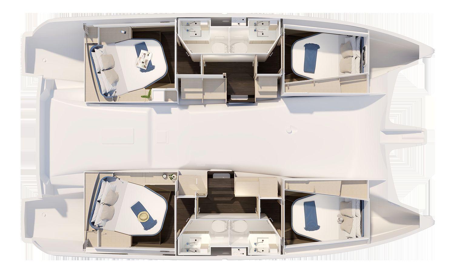 The New 41 is available in a “maestro” owner's version, with the port hull converted into a suite, and in a “quartet” version, offering 4 cabins and 2 to 4 bathrooms. All cabins enjoy sea views thanks to large portholes and wide beds thanks to the hull steps.