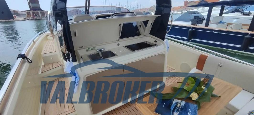 Water pressure pump, Special Colour (Vanilla Sea), Deck Shower (caldo/freddo), Hard top (Carbonio), Washbasin in the cockpit, Underwater lights, Platform (teak), Teak Cockpit, Shorepower connector, Electric Windlass, swimming ladder (a scomparsa), cockpit table (teak).
