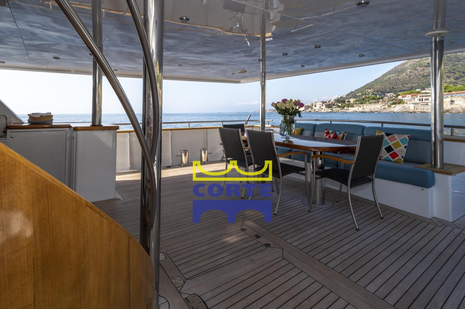 Fume/Gas Detector, Engine Alarm, Bilge Alarm, Water pressure pump, Draining System, Teak Side Decks, Deck Shower, Twin Steering, Davits for tender on fly, Fire Extinguishing System, Anchor Chain Washdown, Courtesy Lights, Gangway (elettroidraulica), Platform (poppa in teak), Automatic Bilge Pump, Manual Bilge Pump, Entry door, Side door, Teak Cockpit, Shorepower connector, Water harbor connector system, Electric Windlass, swimming ladder, Stabilizers (pinne Vosper Wave Beta 3), cockpit table, Horn, 2 Stern Winches, Bow Winches.