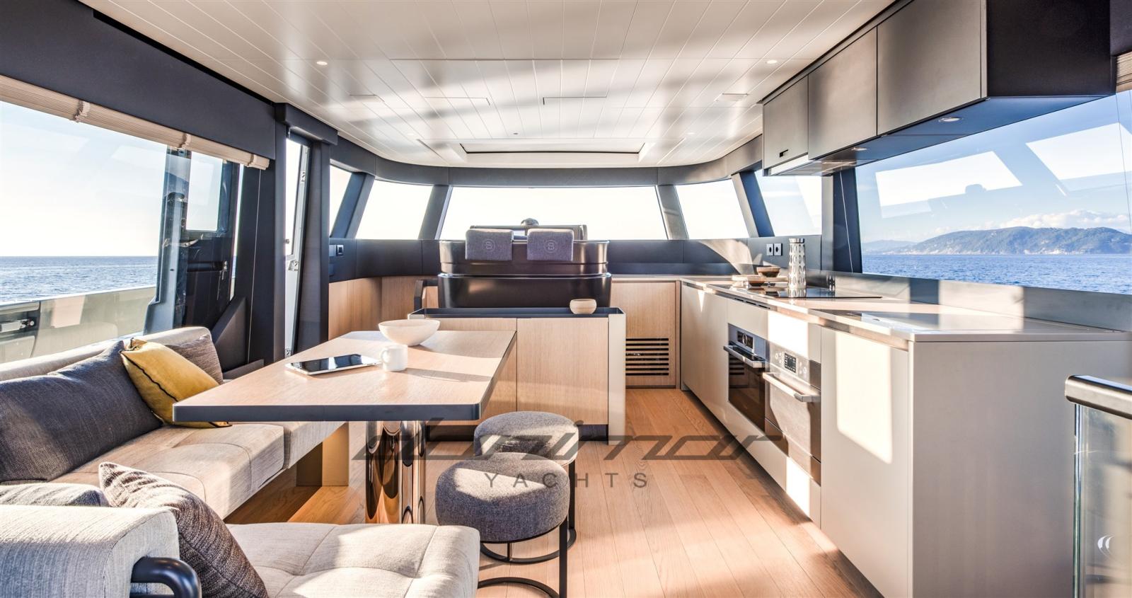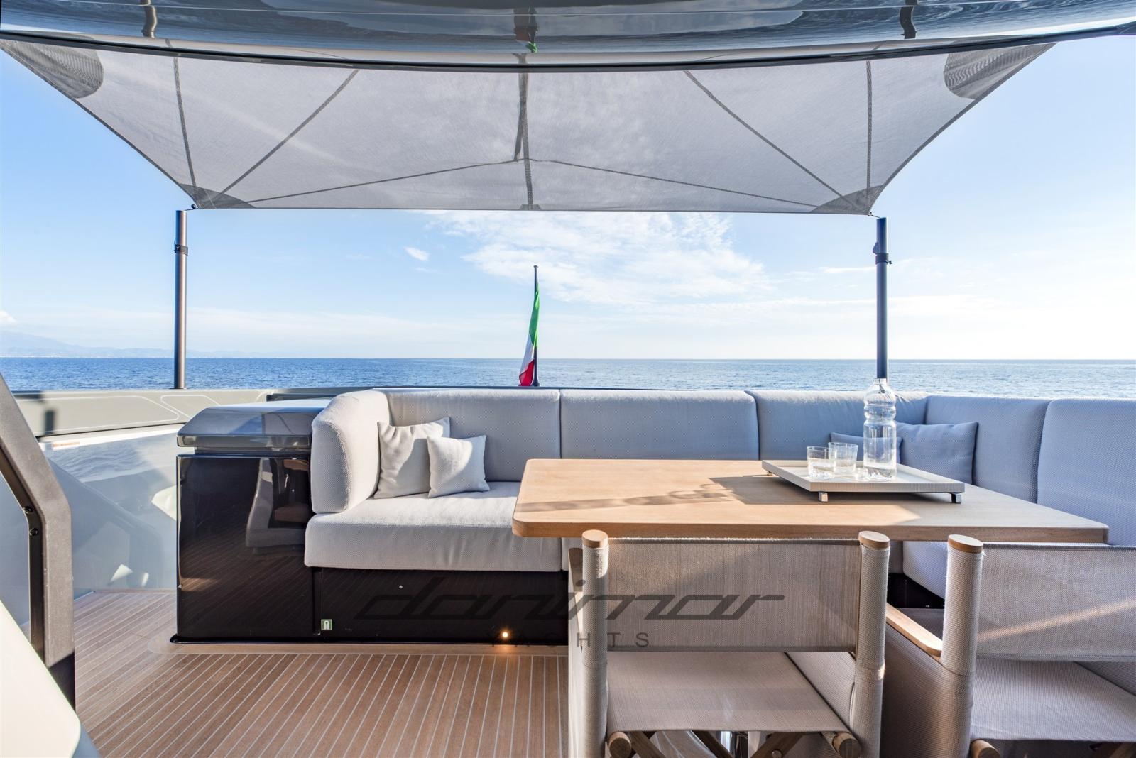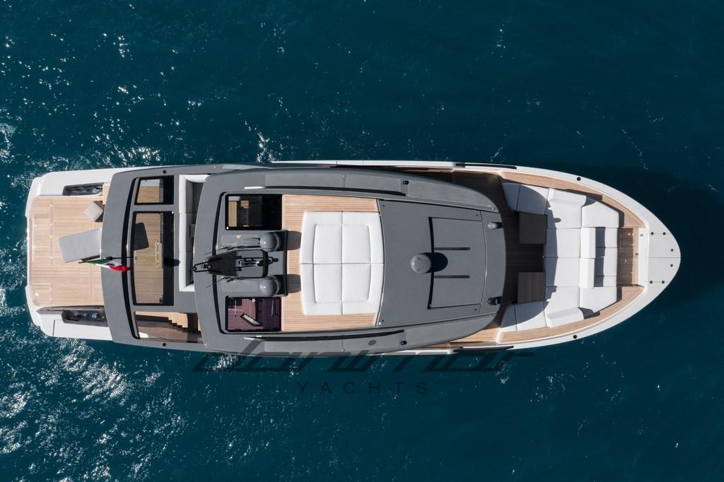 Engine Alarm, Bilge Alarm, Electric Engine Compartment Opening, Auto Dynamic Trim Interceptor, Water pressure pump, Auto-Trim, 2 Folding cleats, Draining System, Teak Side Decks, Deck Shower, Headlights fixed on the stem, Directional Spotlight, Crane, Hard top, Fire Extinguishing System, Anchor Chain Washdown, Washbasin in the cockpit, Courtesy Lights, Underwater lights, Gangway (Pantograph), Platform, 3 Entry door, Side door, Teak Cockpit, Shorepower connector, Electric Windlass, swimming ladder (Pantograph), Stabilizers (gyro), cockpit table (Private terrace in upper deck), Horn, 2 Stern Winches, Bow Winches.