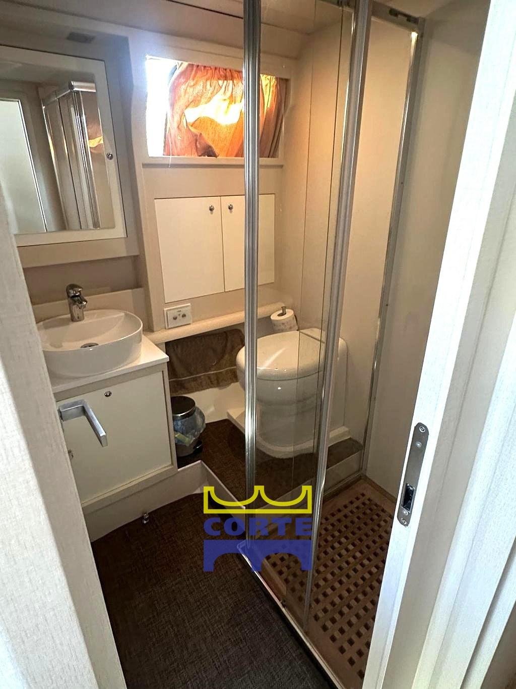Large cockpit with comfortable sofa and six-seater table. Cabinet with barbecue plate and fridge. Access to the crew cabin, equipped complete with toilets.