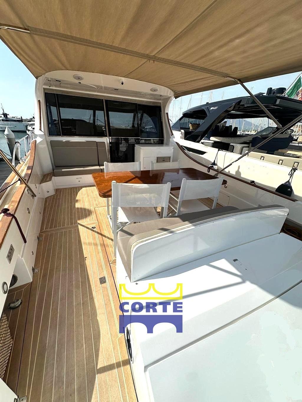 Fume/Gas Detector, Engine Alarm, Bilge Alarm, Water pressure pump, Teak Side Decks, Shore power cable, Special Colour, Guard rail, Deck Shower, Directional Spotlight, Hydraulic Flaps, Hard top, Fire Extinguishing System, Flaps Indicators, Washbasin in the cockpit, Courtesy Lights, Underwater lights, Gangway (elettroidraulica a scomparsa), Platform (di poppa in teak), Automatic Bilge Pump, Teak deck, Entry door, Teak Cockpit, Shorepower connector, Water harbor connector system, Electric Windlass, swimming ladder, cockpit table, Horn, 2 Stern Winches (Quick), Bow Winches.