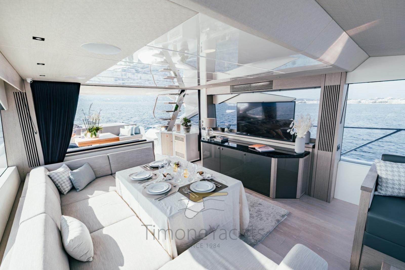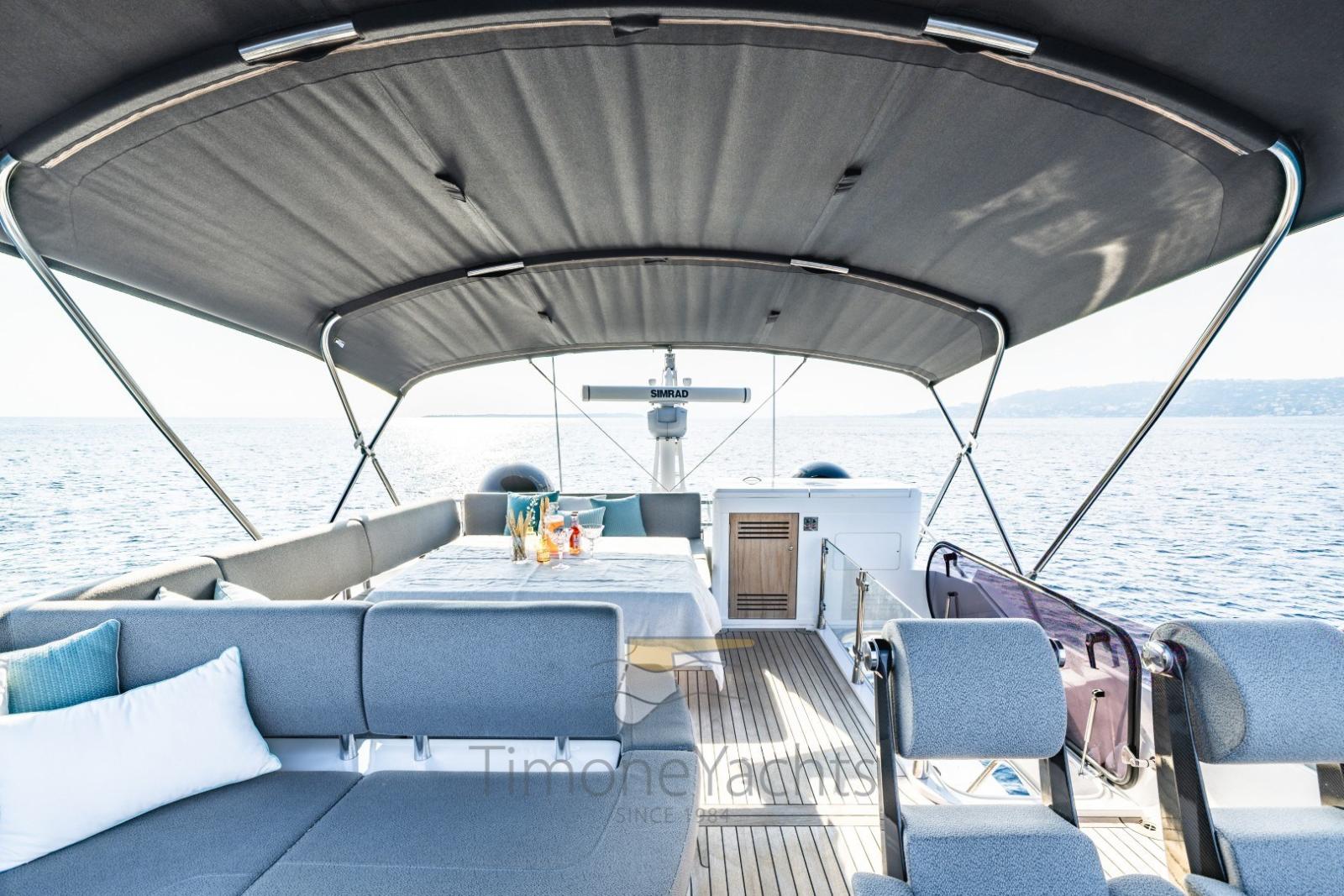 Lot of hotspots: the sortfly so good, and same is the front deck are. Yet the Vessel is giving her very best between cockpit and Salon. The exterior part is magnificent, the stern sunpad wisely joins the cockpit living area; immense the dining table there. Then the cockpit turns into the salon in a such natural ambient flowing.