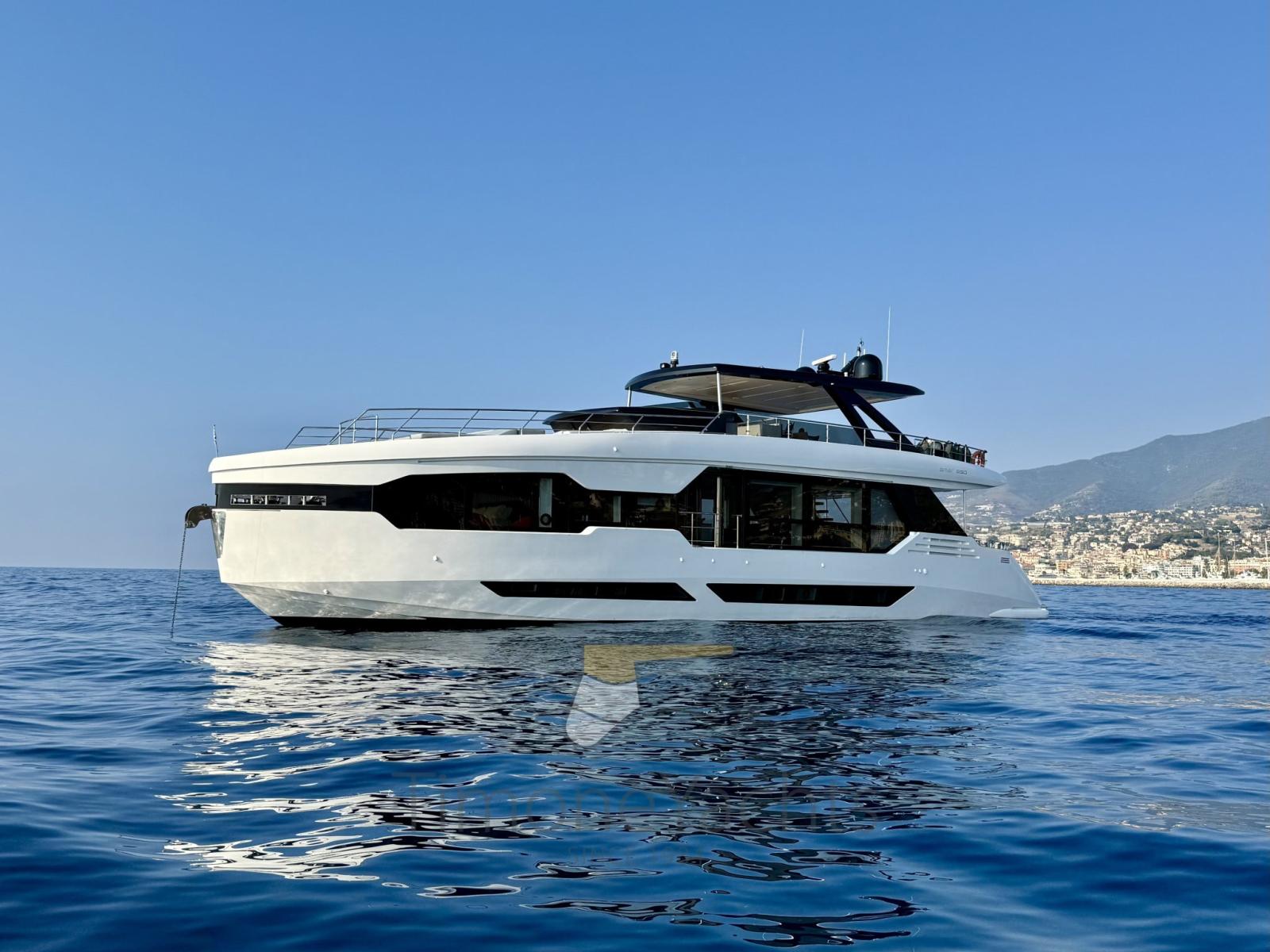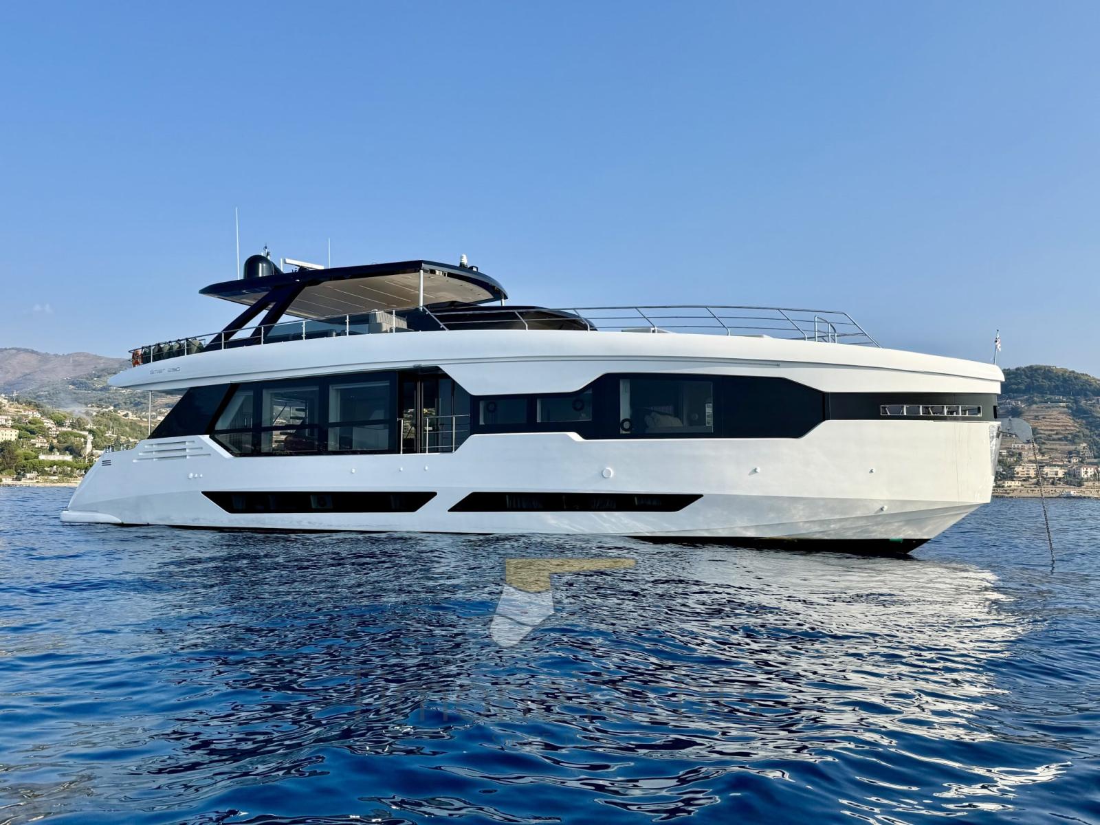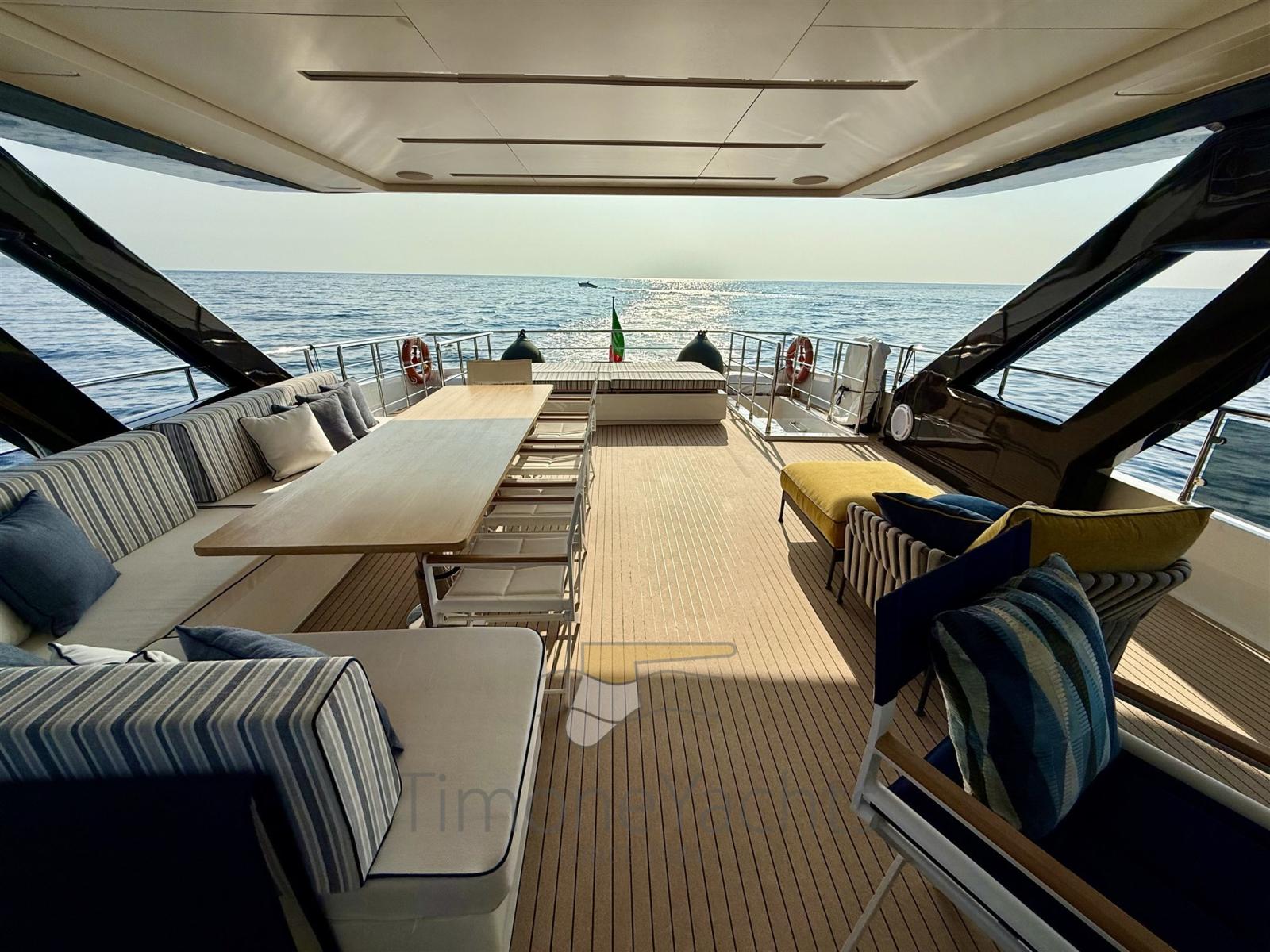 Fume/Gas Detector, Engine Alarm, Bilge Alarm, Alternator, Auto Dynamic Trim Interceptor, Water pressure pump, Auto-Trim, Teak Side Decks, Shore power cable, Deck Shower, Twin Steering, Directional Spotlight, Hydraulic Flaps, Tender Garage, Hard top, Fire Extinguishing System, Flaps Indicators, Anchor Chain Washdown, Courtesy Lights, Underwater lights, Gangway, Platform, Deck Wash Pump, Teak deck, Entry door, 2 Side door, Teak Cockpit, Shorepower connector, Water harbor connector system, Electric Windlass, Stabilizers (Seakeeper 16\18 + Fins (zero speed + underway))), cockpit table, Tender (Surmarine ST 400 Prestige 40 Cv Yamaha), guard rails with gates, Horn, 2 Stern Winches, Bow Winches.