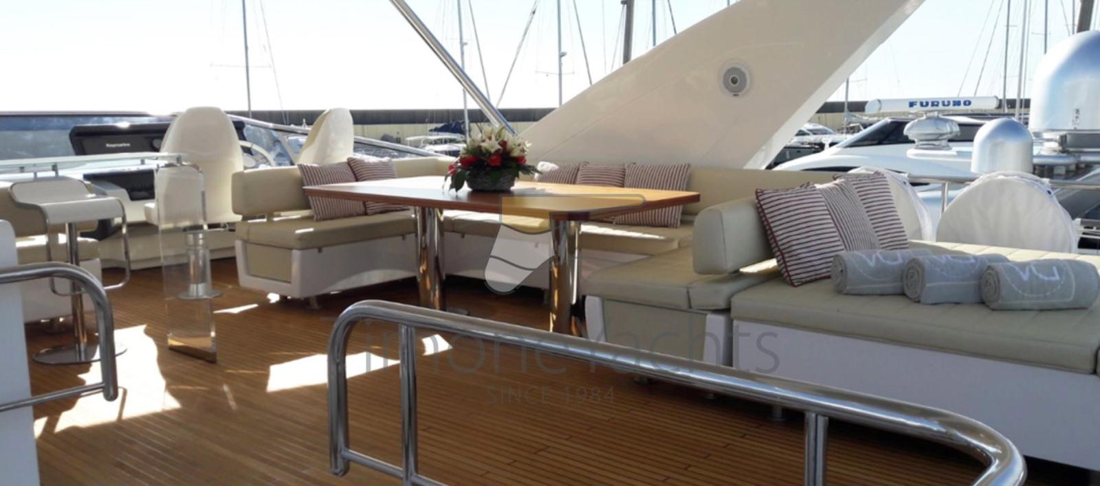 This vessel has always been a private vessel, with one owner and VAT paid. Stabilized, with an up/down aft swim platform, and light oak interiors. Four guest cabins, three crew sleeps, and a day head. The flybridge is immense and very well-appointed.