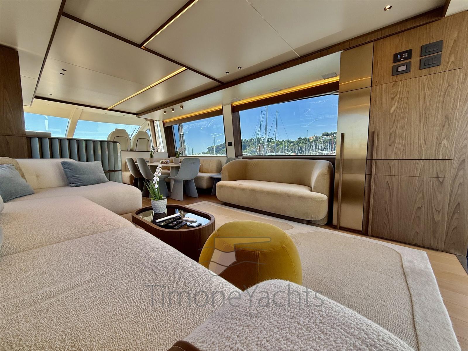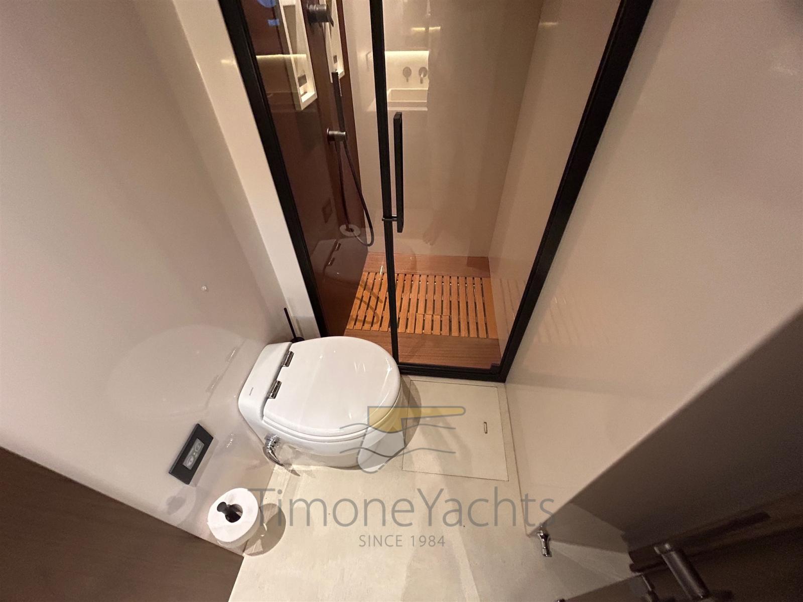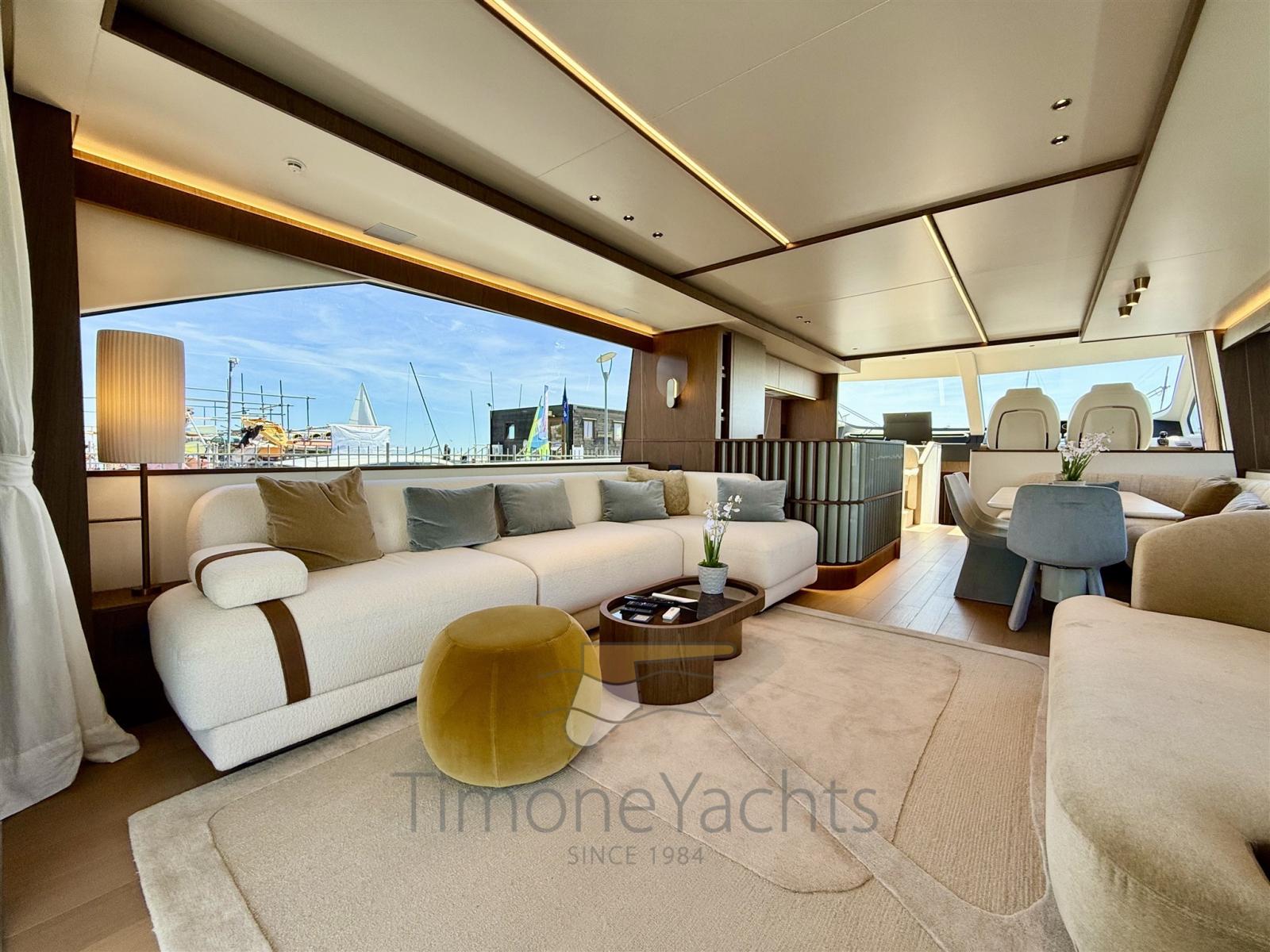 Fume/Gas Detector, Engine Alarm, Bilge Alarm, Alternator, Water pressure pump, Teak Side Decks, Deck Shower, Twin Steering, Directional Spotlight, Hydraulic Flaps, Hard top, Flaps Indicators, Anchor Chain Washdown, Washbasin in the cockpit, Courtesy Lights, Underwater lights, Gangway, Platform, Automatic Bilge Pump, Teak deck, Entry door, Side door, Teak Cockpit, Shorepower connector, Water harbor connector system, Stabilizers (seakeeper NG 16), cockpit table, Horn, Stern Winches, Bow Winches.