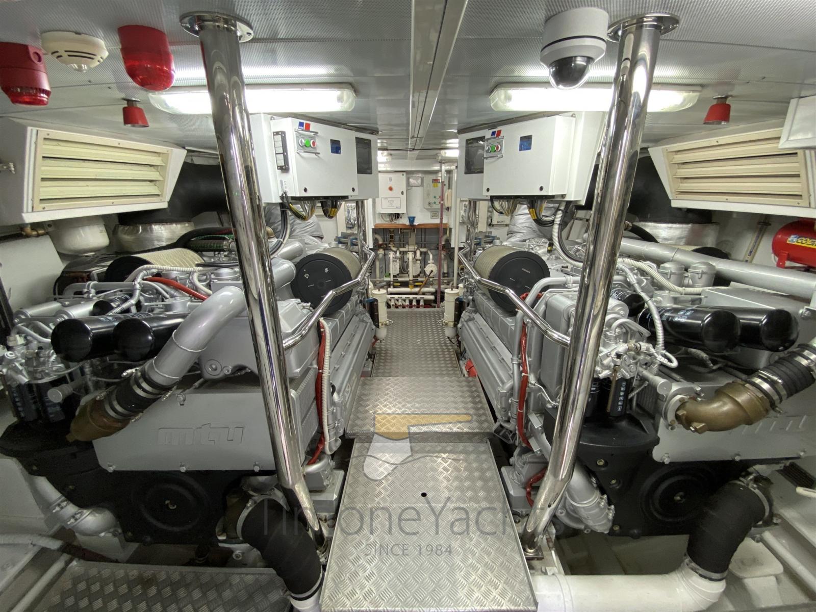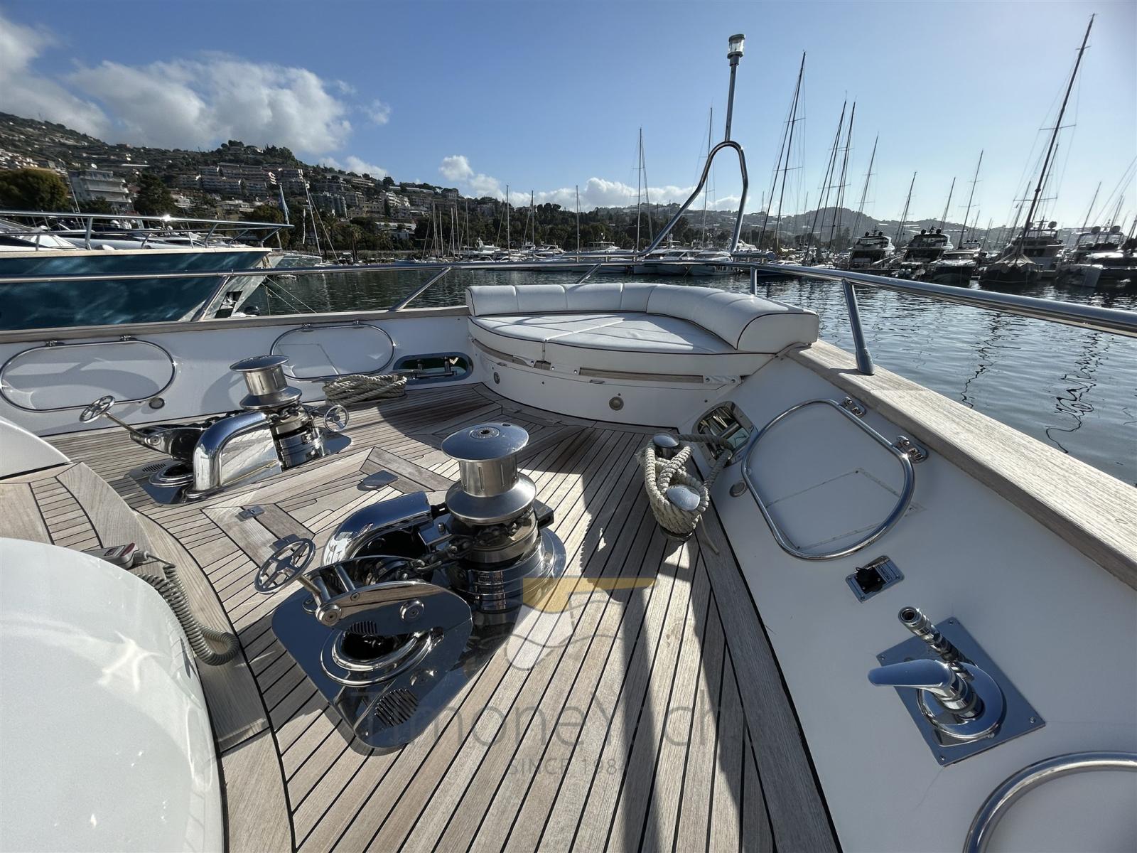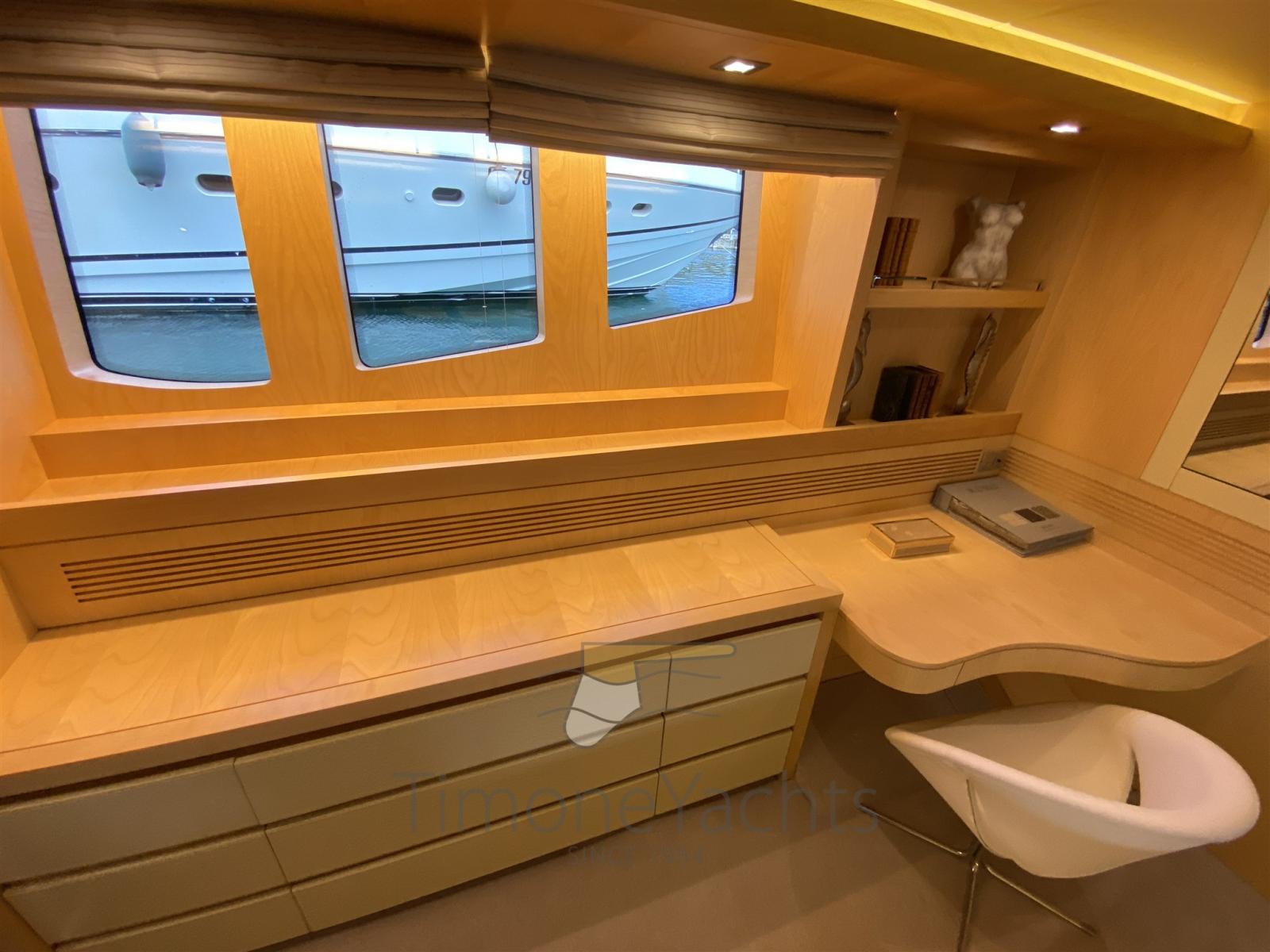 Bilge Alarm, Water pressure pump, Teak Side Decks, Deck Shower, Stern Thruster (Hydraulic), Bow Thruster (Hydraulic), Directional Spotlight, Hydraulic Flaps, Tender Garage, Crane, Davits for tender on fly (nel garage di prua, in the garage up front on main deck), Hard top, Fire Extinguishing System, Flaps Indicators, Anchor Chain Washdown, Courtesy Lights, Gangway, Platform, Side door, Teak Cockpit, Shorepower connector, Water harbor connector system, Voltage Rectifier, Electric Windlass, Gang Board, swimming ladder, Stabilizers, cockpit table, Tender, Horn, Stern Winches, Bow Winches.