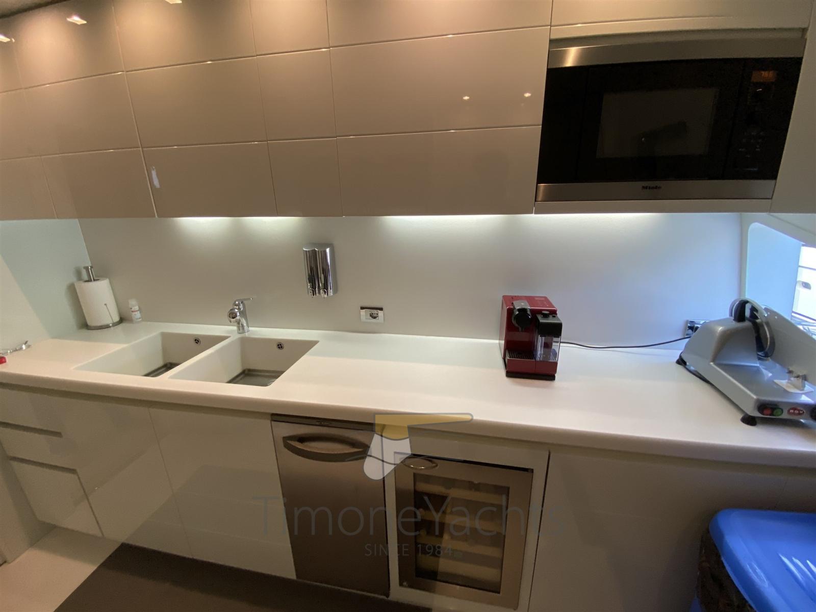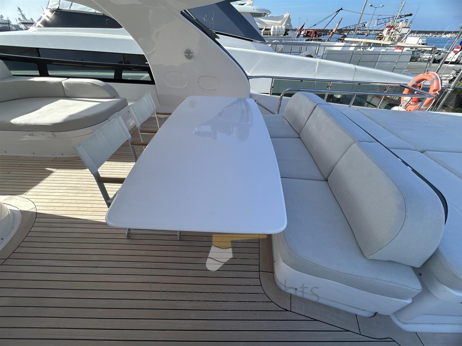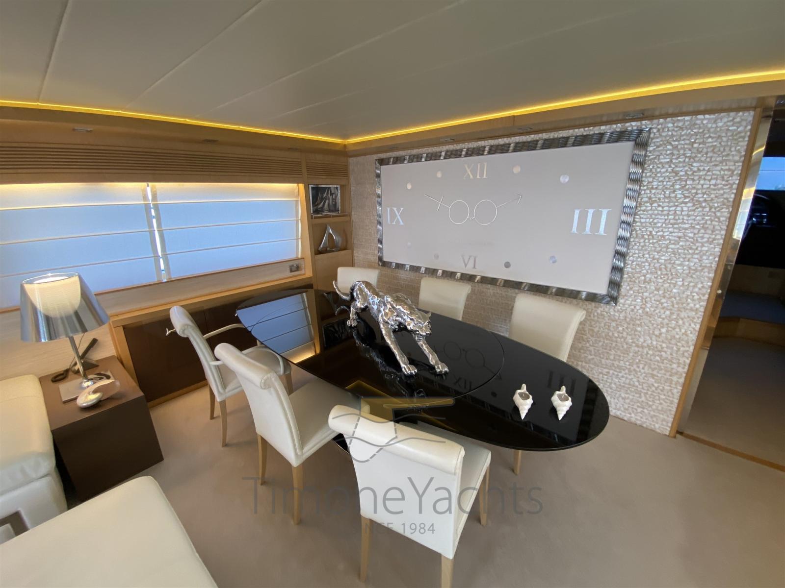 Bilge Alarm, Water pressure pump, Teak Side Decks, Deck Shower, Stern Thruster (Hydraulic), Bow Thruster (Hydraulic), Directional Spotlight, Hydraulic Flaps, Tender Garage, Crane, Davits for tender on fly (nel garage di prua, in the garage up front on main deck), Hard top, Fire Extinguishing System, Flaps Indicators, Anchor Chain Washdown, Courtesy Lights, Gangway, Platform, Side door, Teak Cockpit, Shorepower connector, Water harbor connector system, Voltage Rectifier, Electric Windlass, Gang Board, swimming ladder, Stabilizers, cockpit table, Tender, Horn, Stern Winches, Bow Winches.