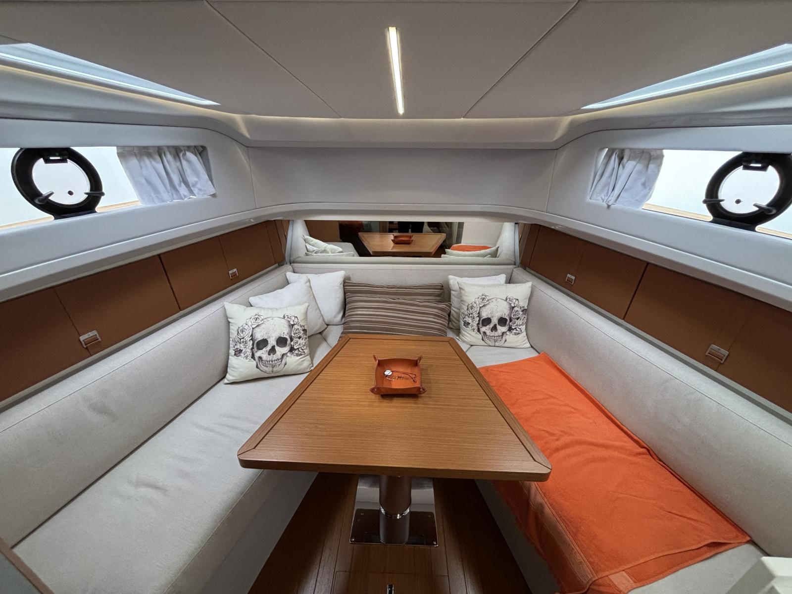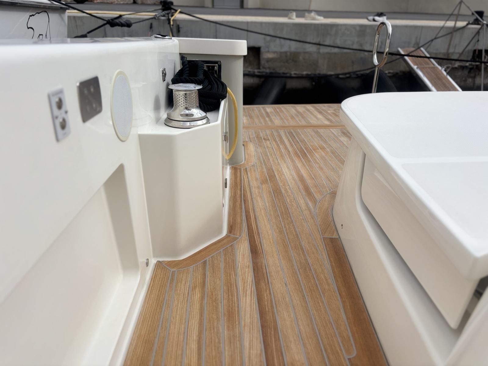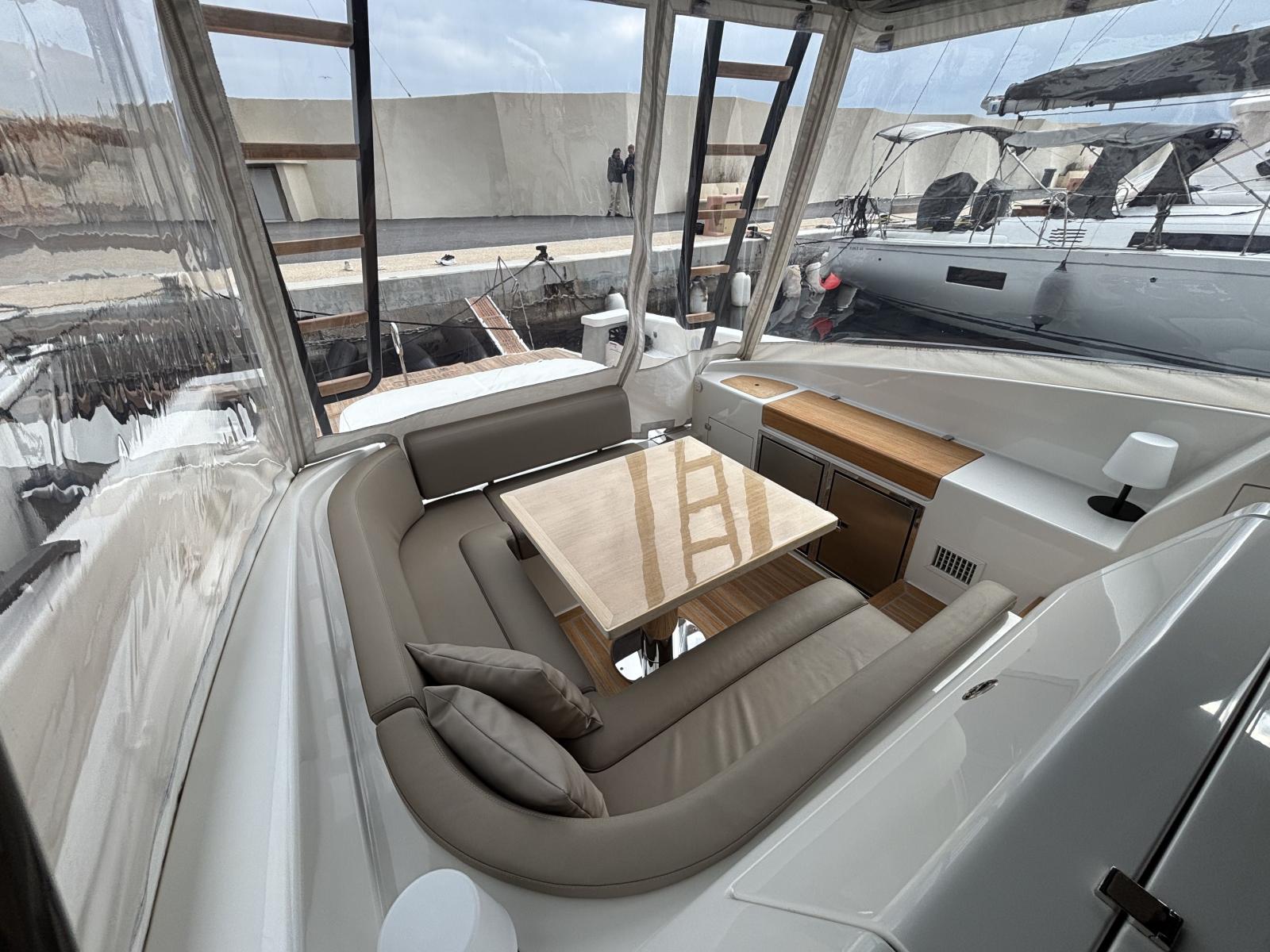 Cockpit and exterior saloon designed for outdoor living: complete enclosure of the saloon with Crystal window covers featuring large windows (2024) and side shade sails (2024) for maximum comfort at anchor and underway. Autoterm 5 kW exterior heating allows year-round use of the outdoor spaces (mid-season/winter). Enhanced "yacht" comfort is achieved through modernized electrical management and increased autonomy (solar + Victron chargers), ideal for extended stays without access to a marina.