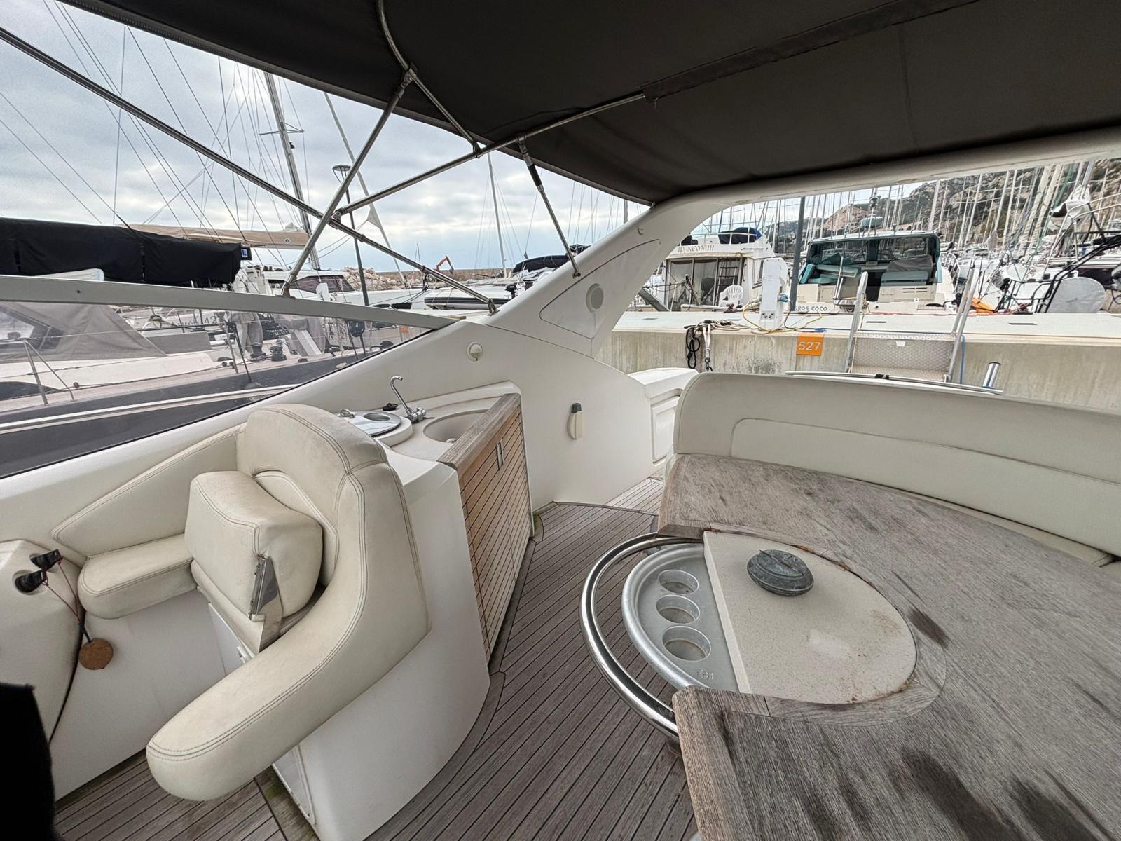 Le cockpit est spacieux et convivial, idéal pour recevoir. Il bénéficie d’un grand coffre électrique, très pratique pour ranger l’annexe, un paddle ou tout le matériel nautique.