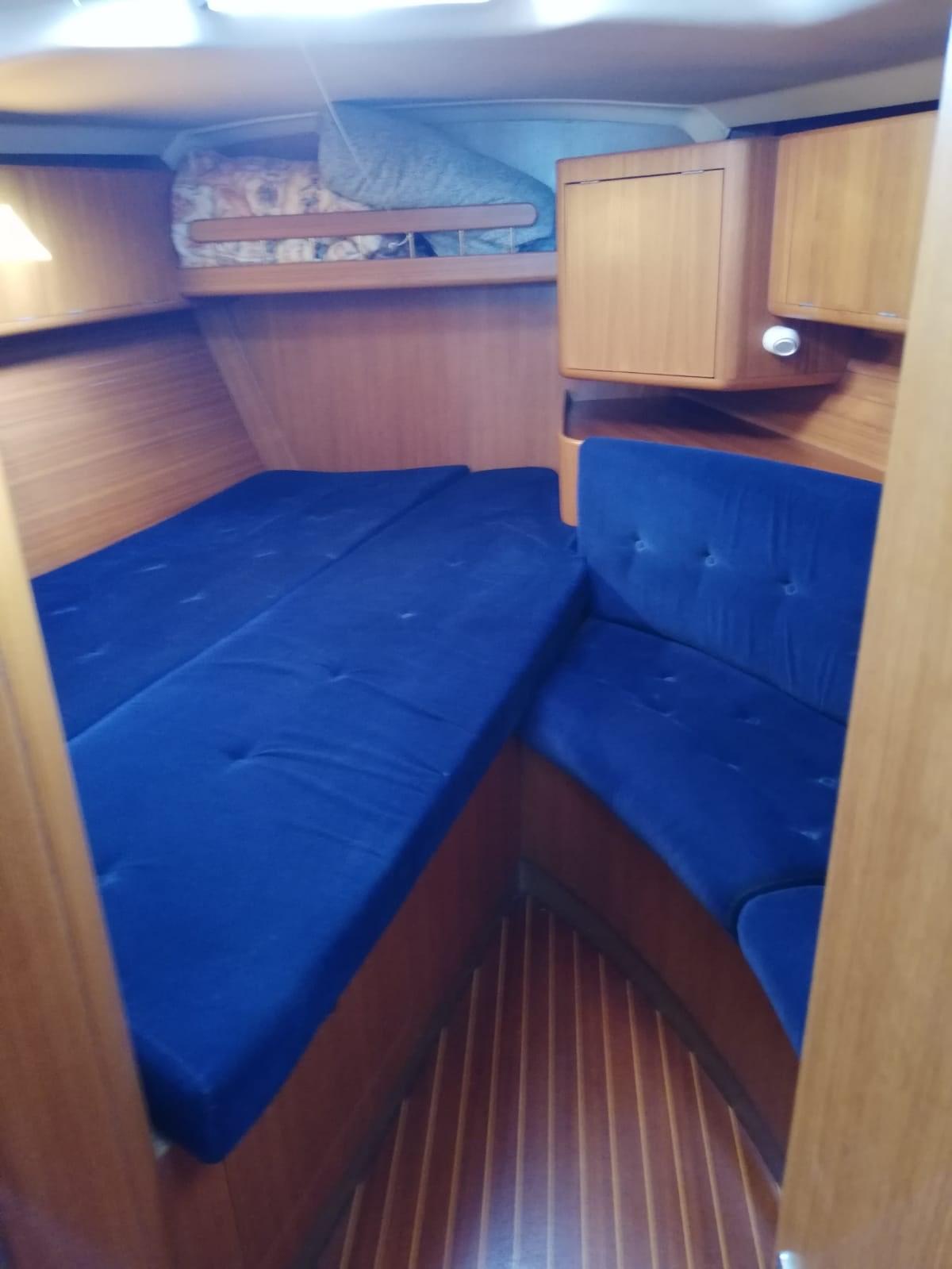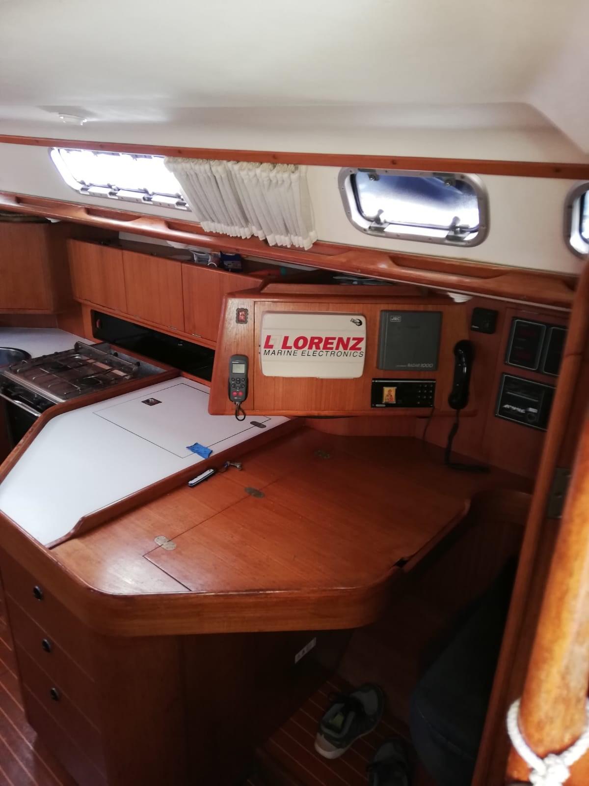 The interiors are covered in teak. The seat of the semicircular square is located on the left, in front of the galley on the side and the equipped chart table.