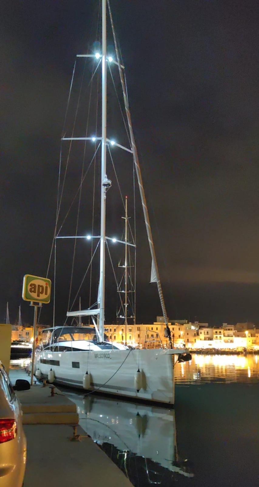 Engine Alarm, Bilge Alarm, Water pressure pump, Teak Side Decks, Deck Shower (calda/fredda), Tender Garage, Tender Crane, Courtesy Lights (nei camminamenti laterali), Underwater lights, Gangway (retrattile acciaio inox), Platform, Automatic Bilge Pump, Manual Bilge Pump, Teak Cockpit, Shorepower connector, Water harbor connector system, Electric Windlass, Strand rigging, swimming ladder, Outboard Engine Support Bracket, 2 cockpit table (abbattibile), Living Room Foldable Table (elettrico), Winch, 2 Winch Electric.