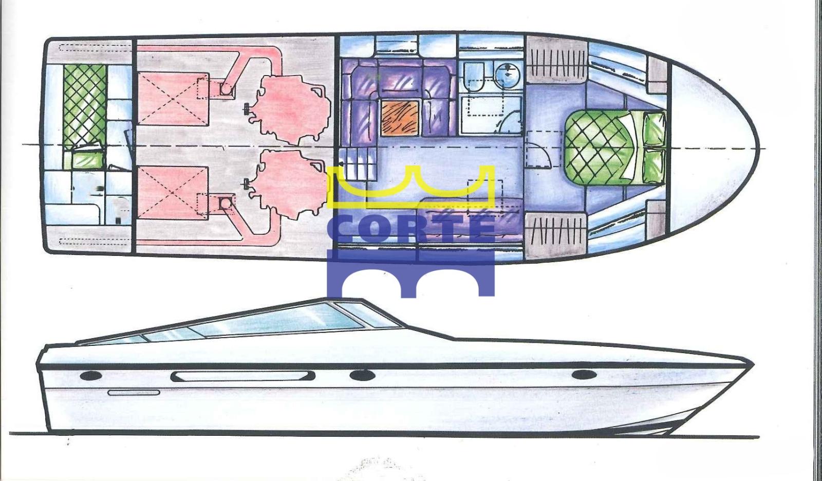 Warm Water System (elettrico scambiatore), Fuel Tank Indicator, Water Tank Meter, Engine oil pressure gauge, Engine temperature gauge, Interior wooden floor (teak), 12V Outlets, 220V Outlets, Electric Toilet.