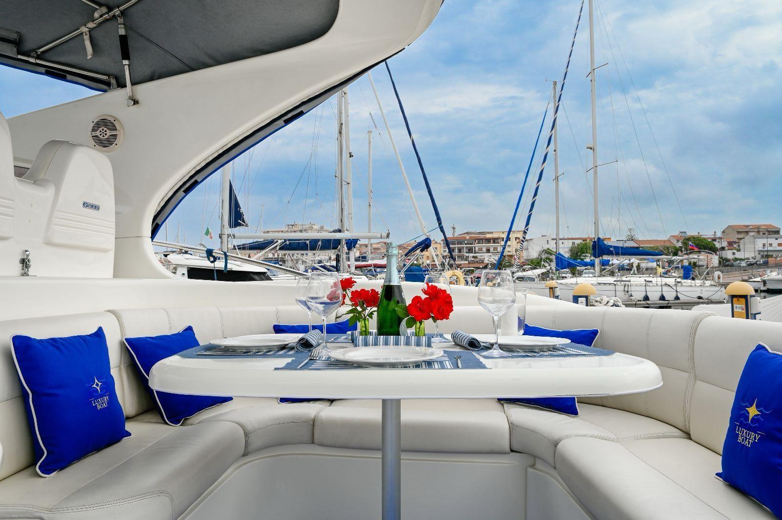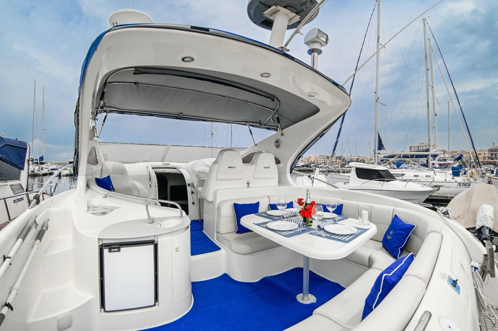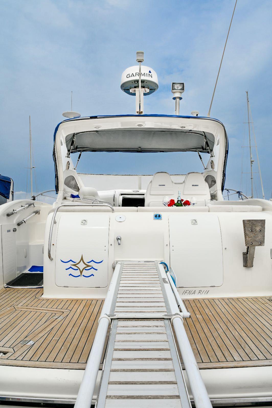 2 Engine Alarm, Bilge Alarm, Alternator, Water pressure pump, Deck Shower, Hydraulic Flaps, Fire Extinguishing System, Flaps Indicators, Washbasin in the cockpit, Courtesy Lights, Gangway, Platform (elettro idraulica), Entry door, Shorepower connector, Rollbar, Electric Windlass, swimming ladder, cockpit table, Living Room Foldable Table, Horn.