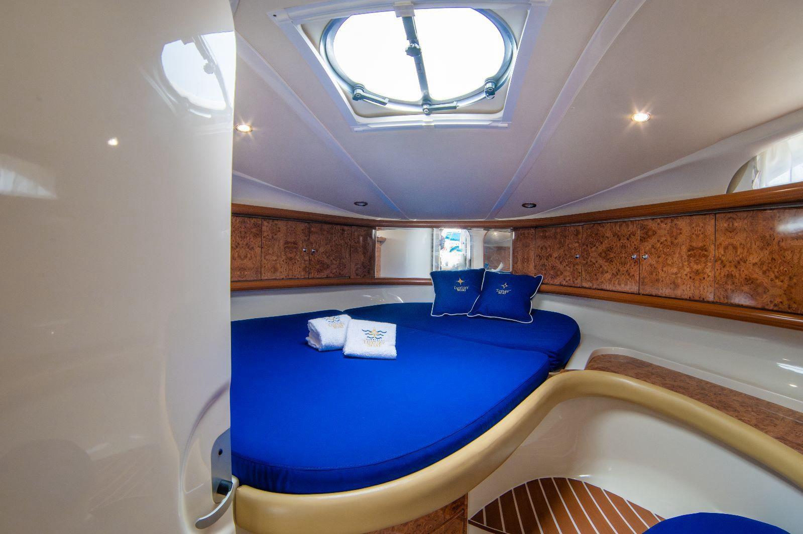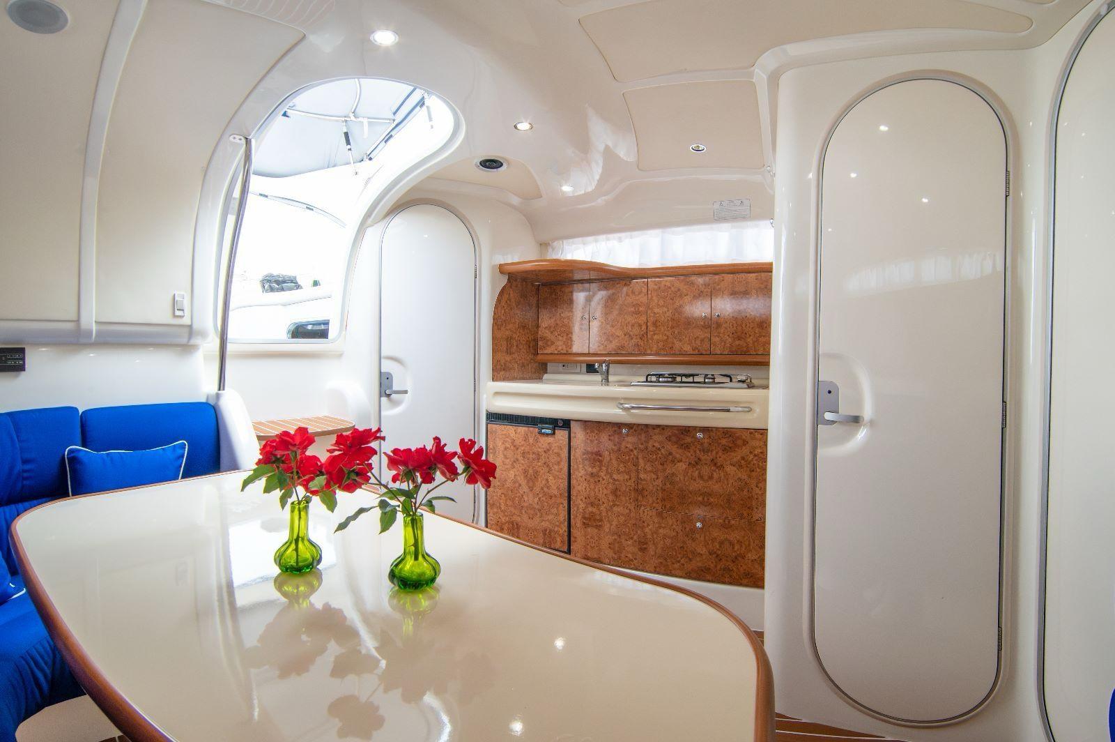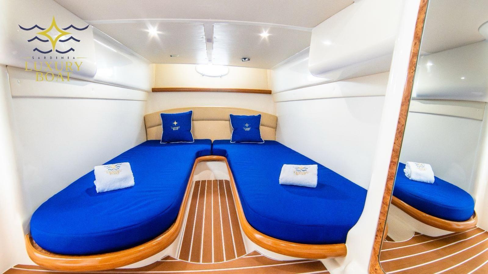 2 Engine Alarm, Bilge Alarm, Alternator, Water pressure pump, Deck Shower, Hydraulic Flaps, Fire Extinguishing System, Flaps Indicators, Washbasin in the cockpit, Courtesy Lights, Gangway, Platform (elettro idraulica), Entry door, Shorepower connector, Rollbar, Electric Windlass, swimming ladder, cockpit table, Living Room Foldable Table, Horn.