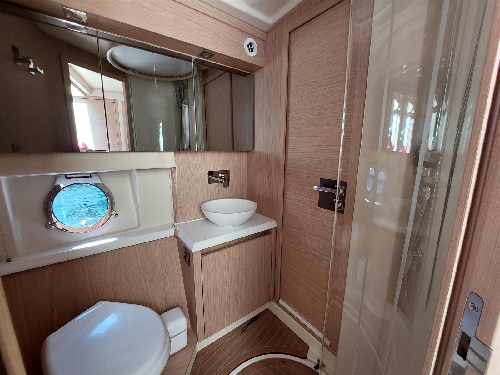 Fume/Gas Detector, Engine Alarm, Bilge Alarm, Water pressure pump, Teak Side Decks, Deck Shower, Twin Steering, Headlights fixed on the stem, Electric Flaps, Tender Garage, Flaps Indicators, Anchor Chain Washdown, Washbasin in the cockpit, Courtesy Lights, Outboard engine for tender, Fenders, Gangway, Platform, Automatic Bilge Pump, Manual Bilge Pump, Teak deck, Entry door, Teak Cockpit, Shorepower connector, Electric Windlass, swimming ladder, Saddles for tender, cockpit table, Living Room Foldable Table, Tender, guard rails with gates, Horn, Stern Winches, Bow Winches.