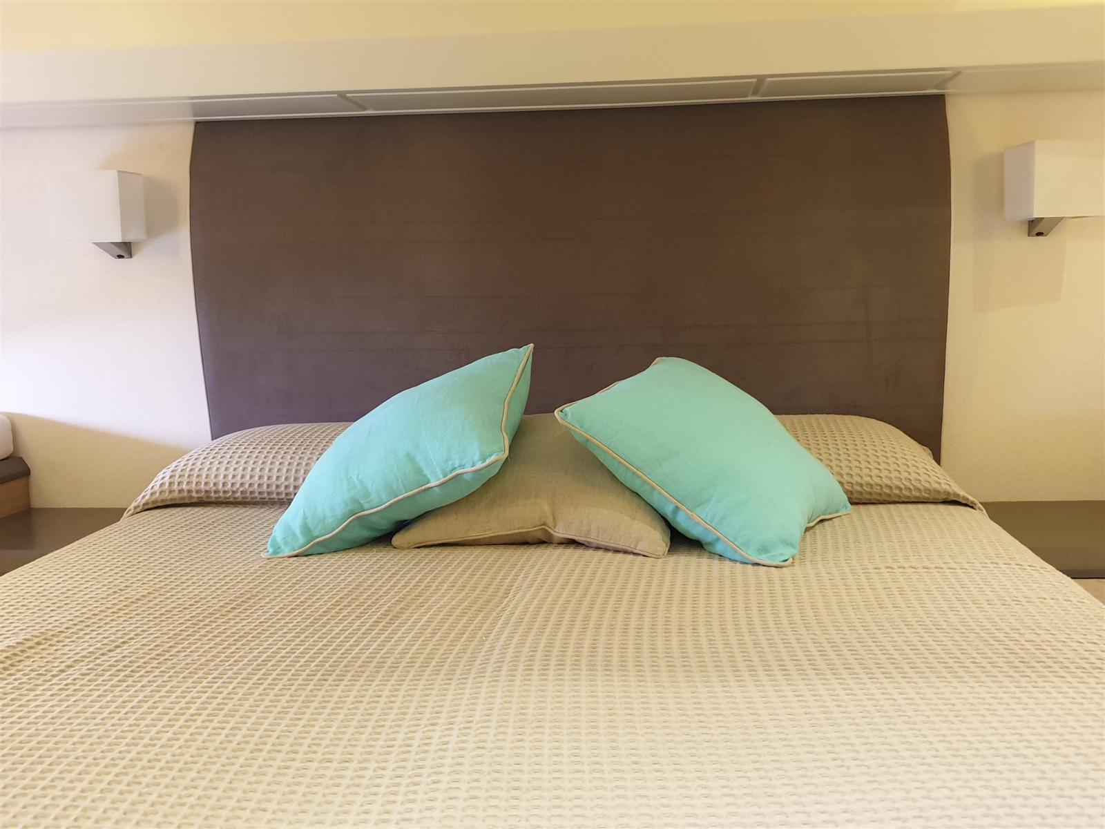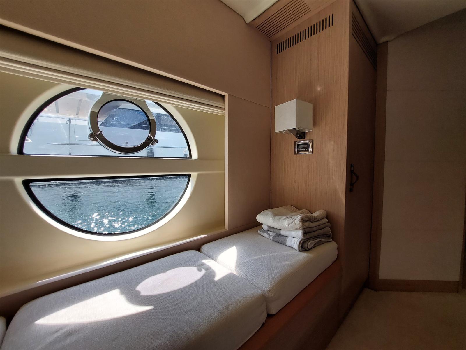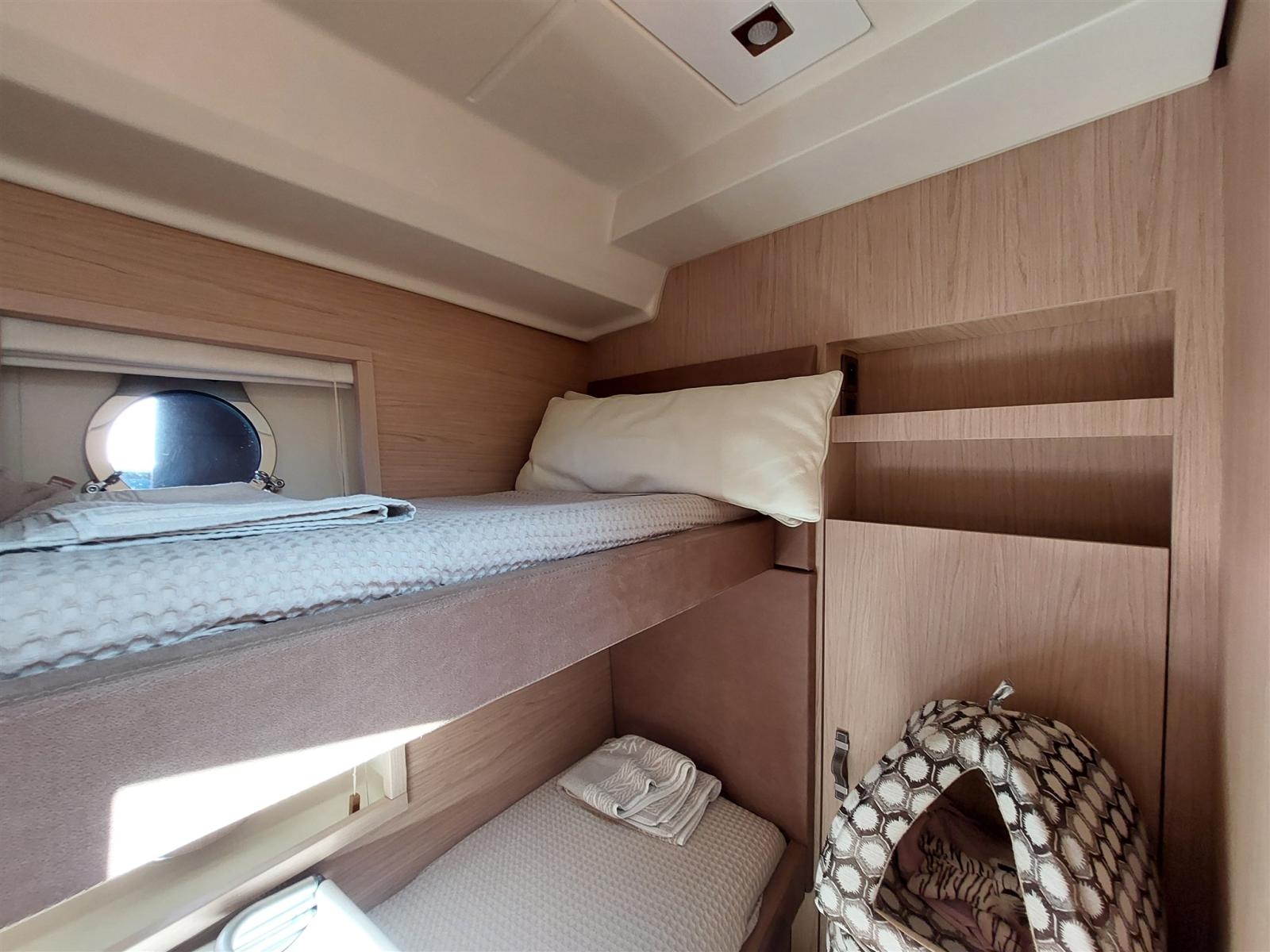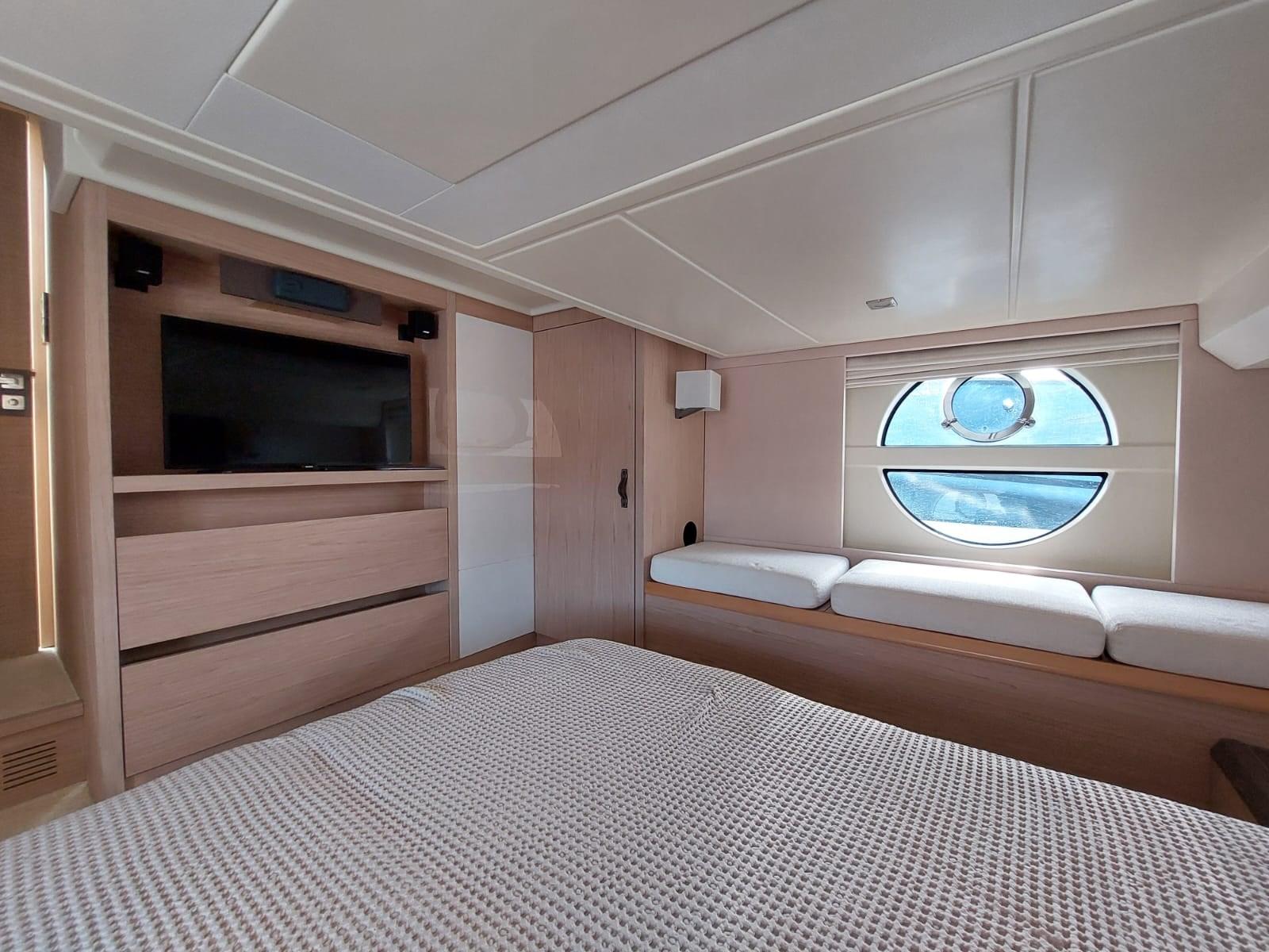 The interior comprises 3 comfortable cabins and 2 bathrooms. The master cabin is full-beam with large circular windows, while the VIP cabin is located in the bow.