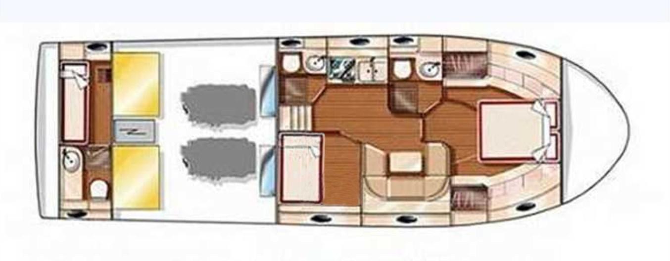 Master cabin with double bed and bathroom (shower cubicle) - guest cabin with French bed - guest bathroom with shower - dinette with kitchenette - single cabin with bathroom aft.