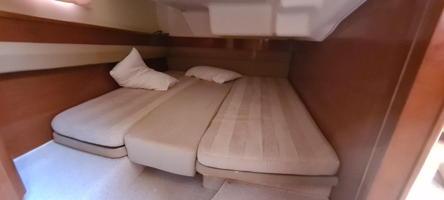 Owner's cabin with double bed and bathroom - guest cabin with two flat beds (convertible to double) - guest bathroom.