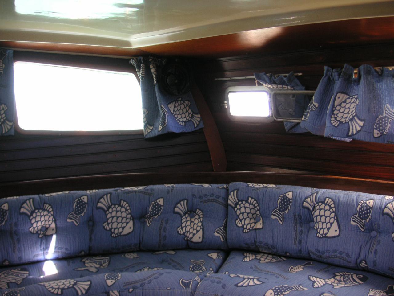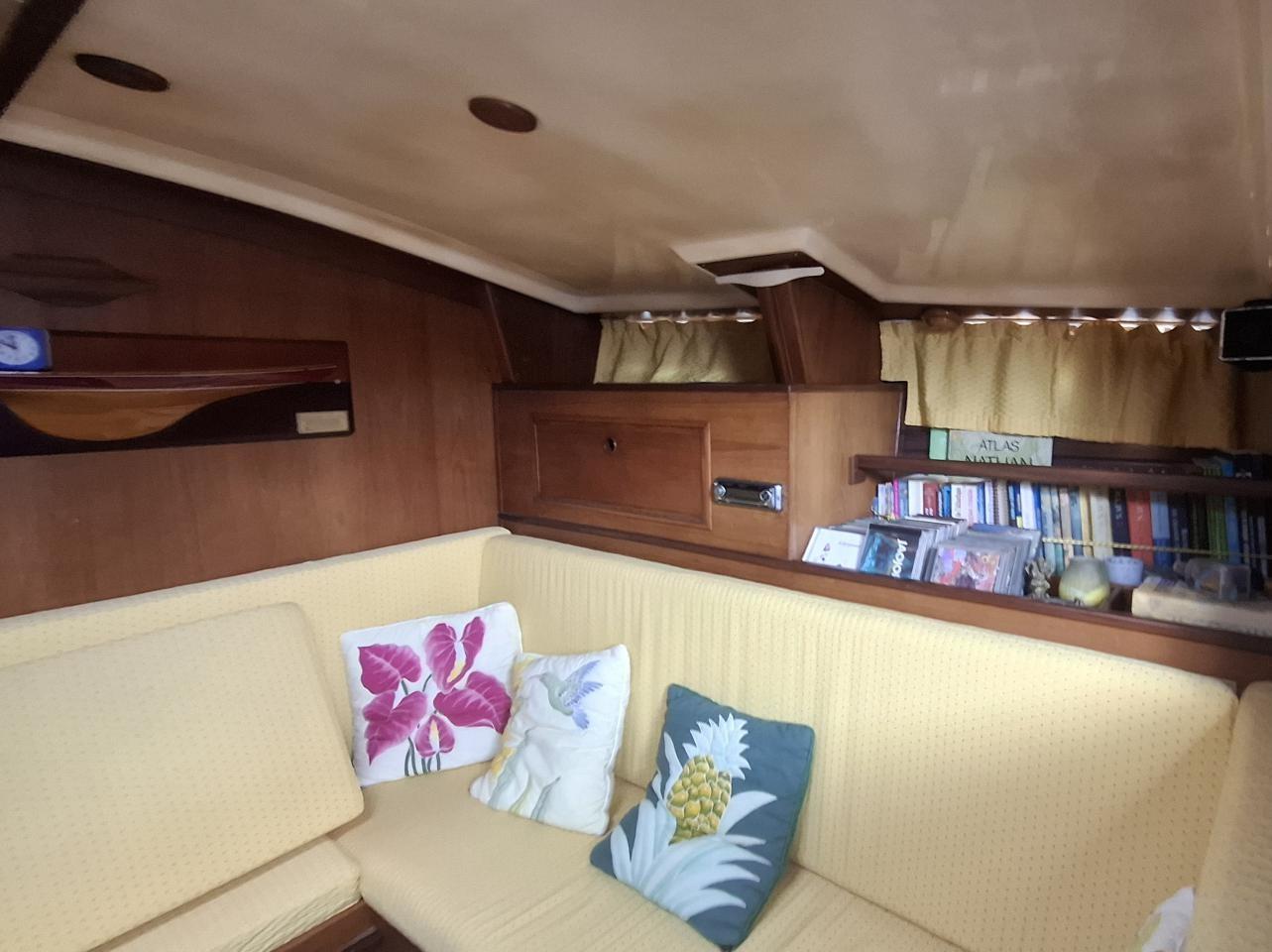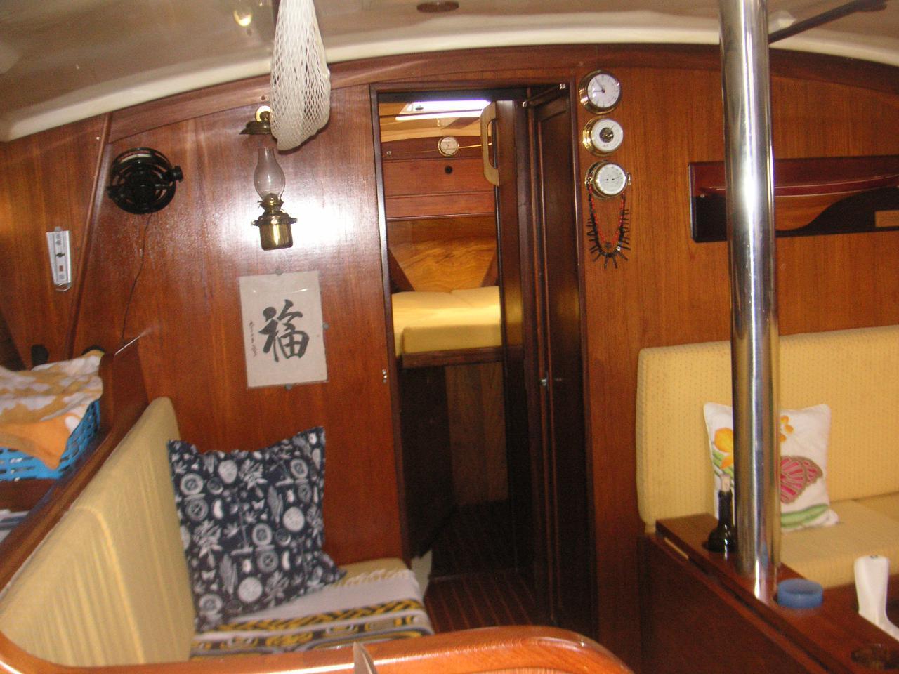Saloon with table and U-shaped bench seat to starboard (sleeping for two people) and port
