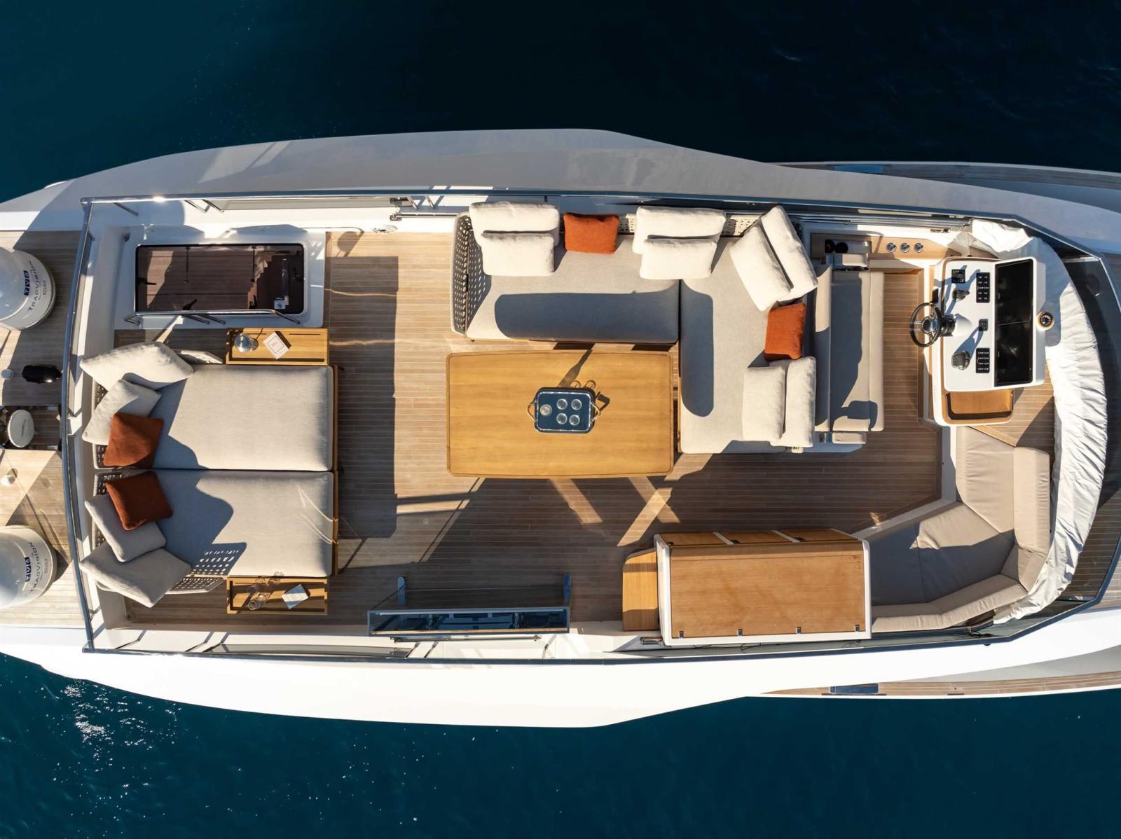 The flybridge, with 27sqm of exterior space, is protected and shaded by a louvered T-top, another exclusive feature of the Endurance range introduced with the new Endurance 72. The low-profile, extremely lightweight superstructure does not affect hull stability, trim and overall aesthetics. Moreover, owners can choose how to arrange the flybridge in terms of materials, fabrics and colors with furniture made in-house by Pardo's carpentry department.