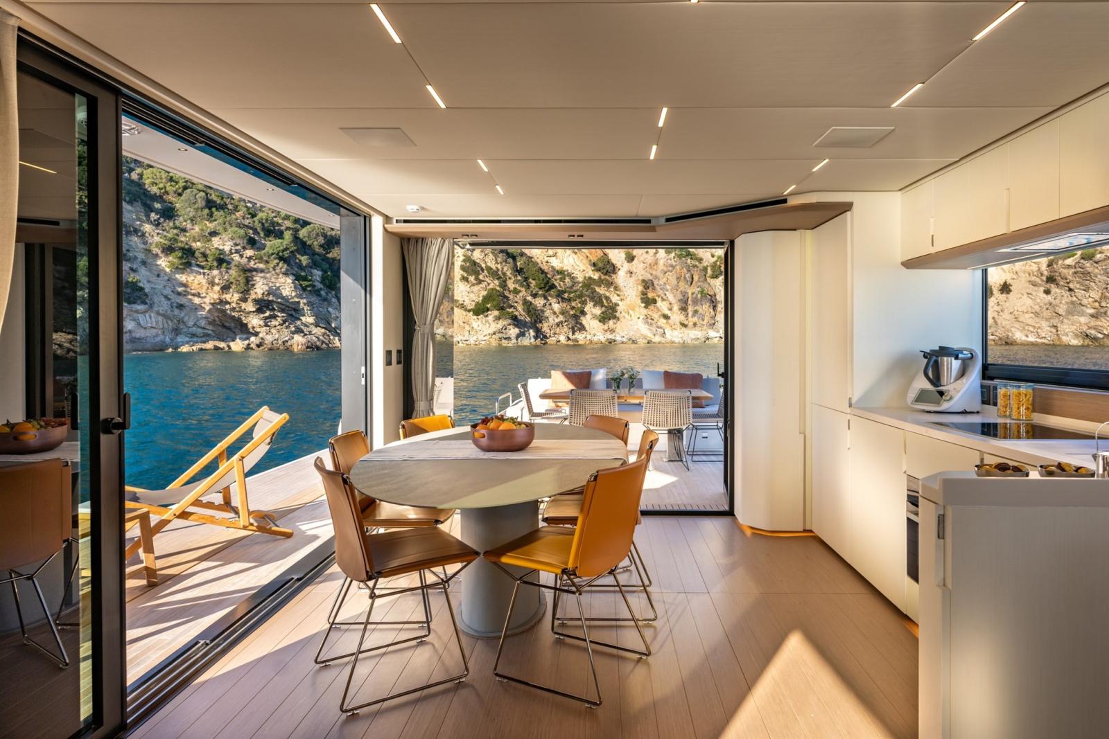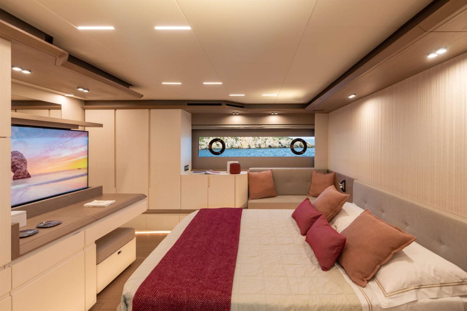 The lighting design has been revamped and improved as well. The introduction and combination of LED and spot lighting in the ceilings provide more focused brightness where required. Finally, the matt black finishes of bathroom accessories, door handles and lighting elements highlight the yacht's sporty yet sophisticated character.