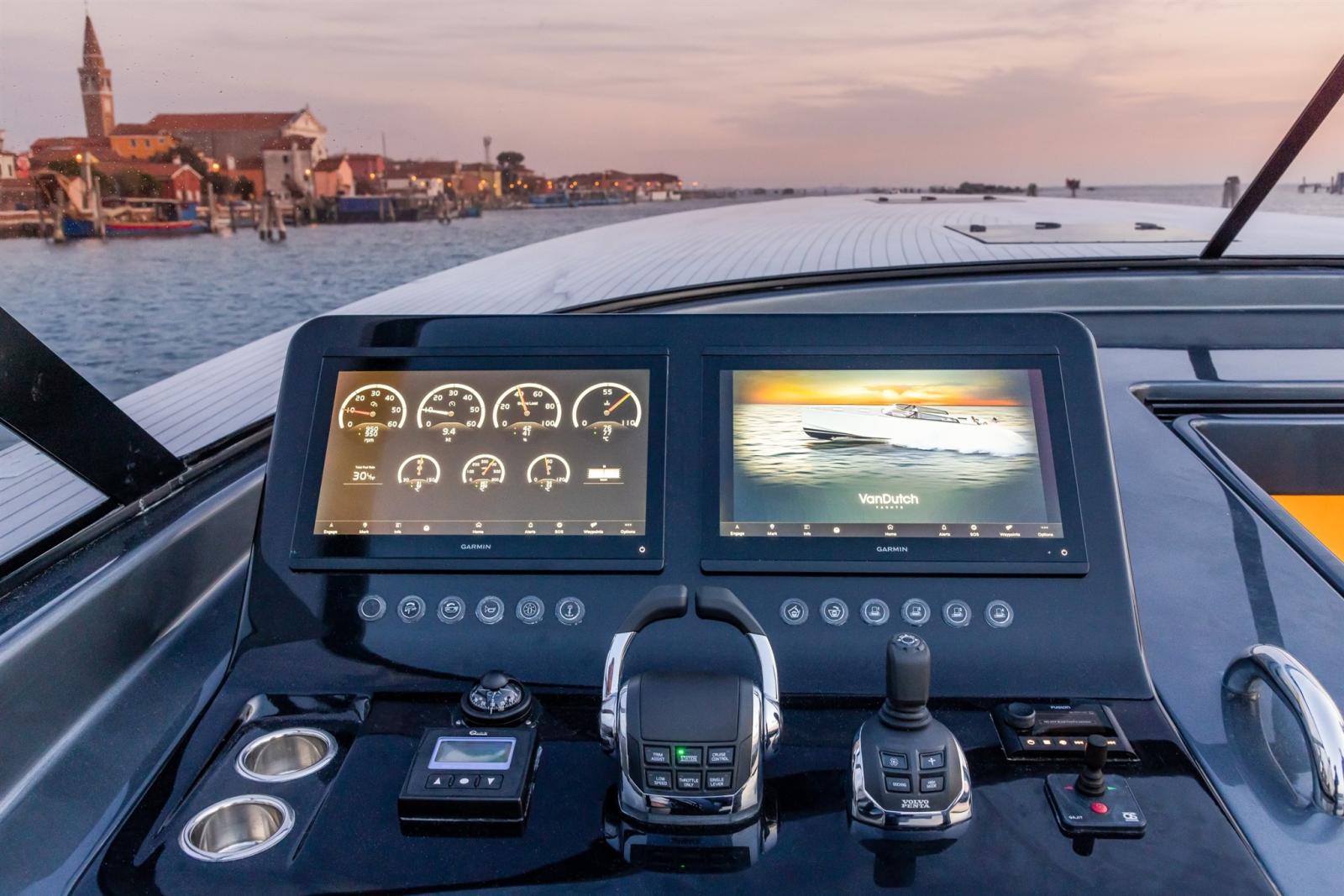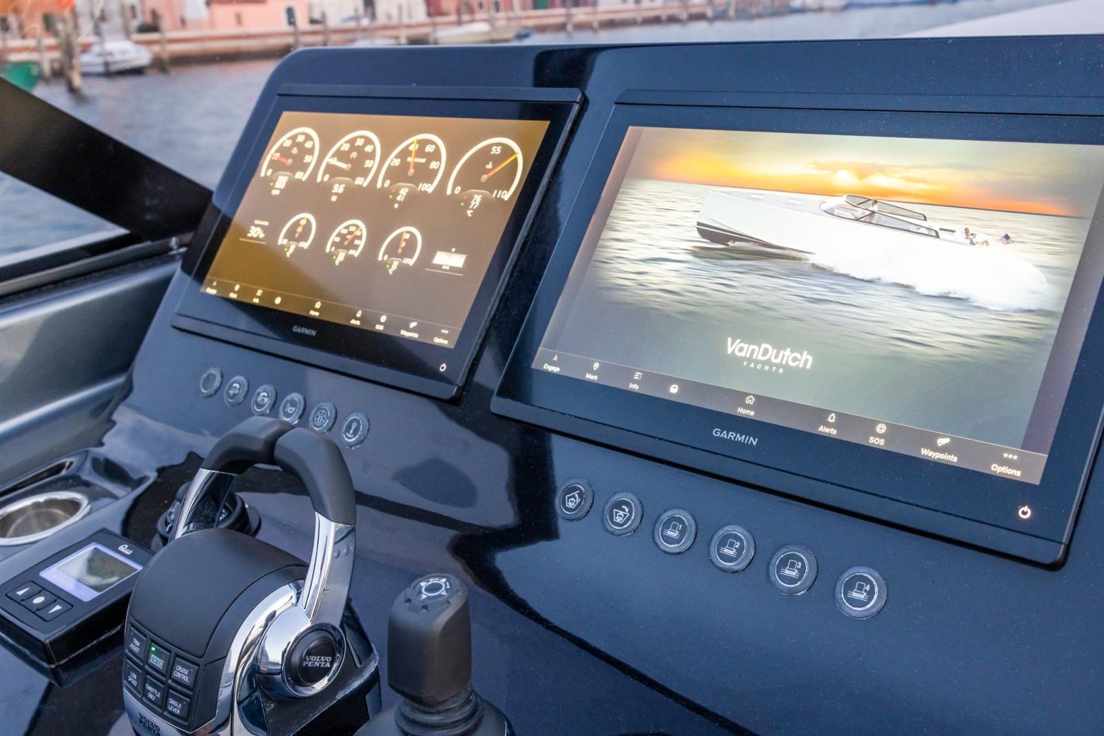 The on-board instrumentation bears the prestigious signature of Garmin Marine with EmpireBus technology. The control of the VanDutch 56 is from a single console that includes two 16-inch displays from which you can coordinate the entire home automation of the boat.