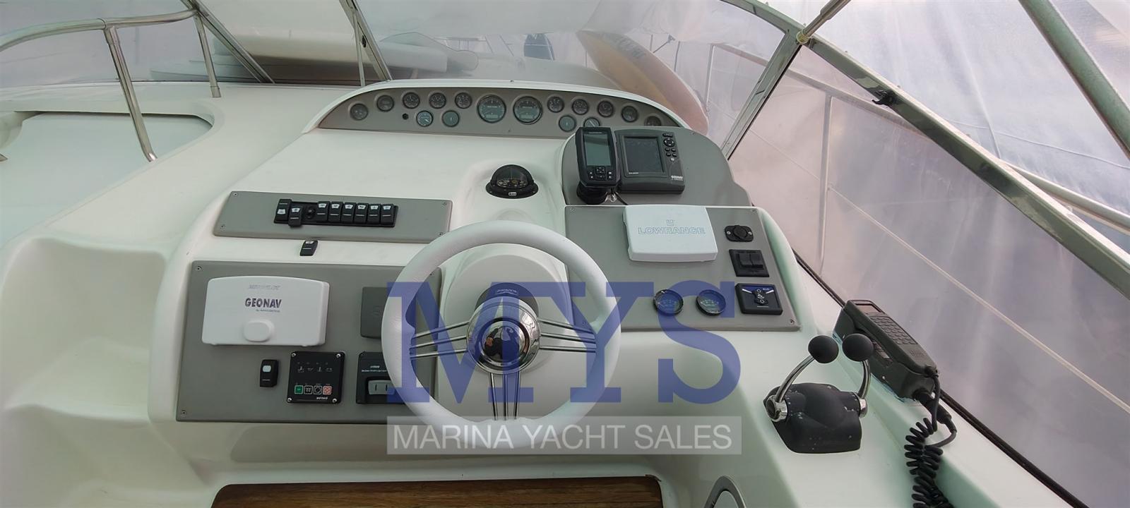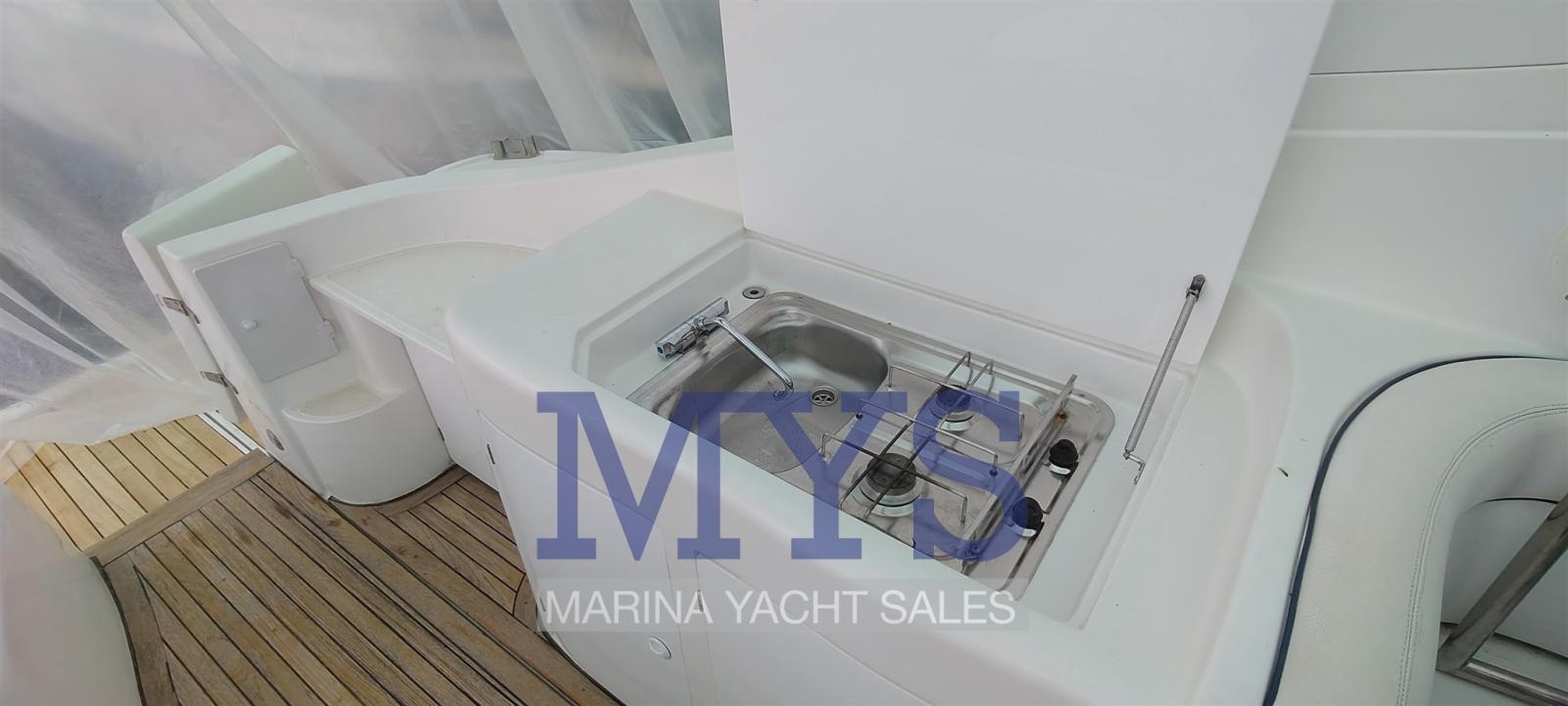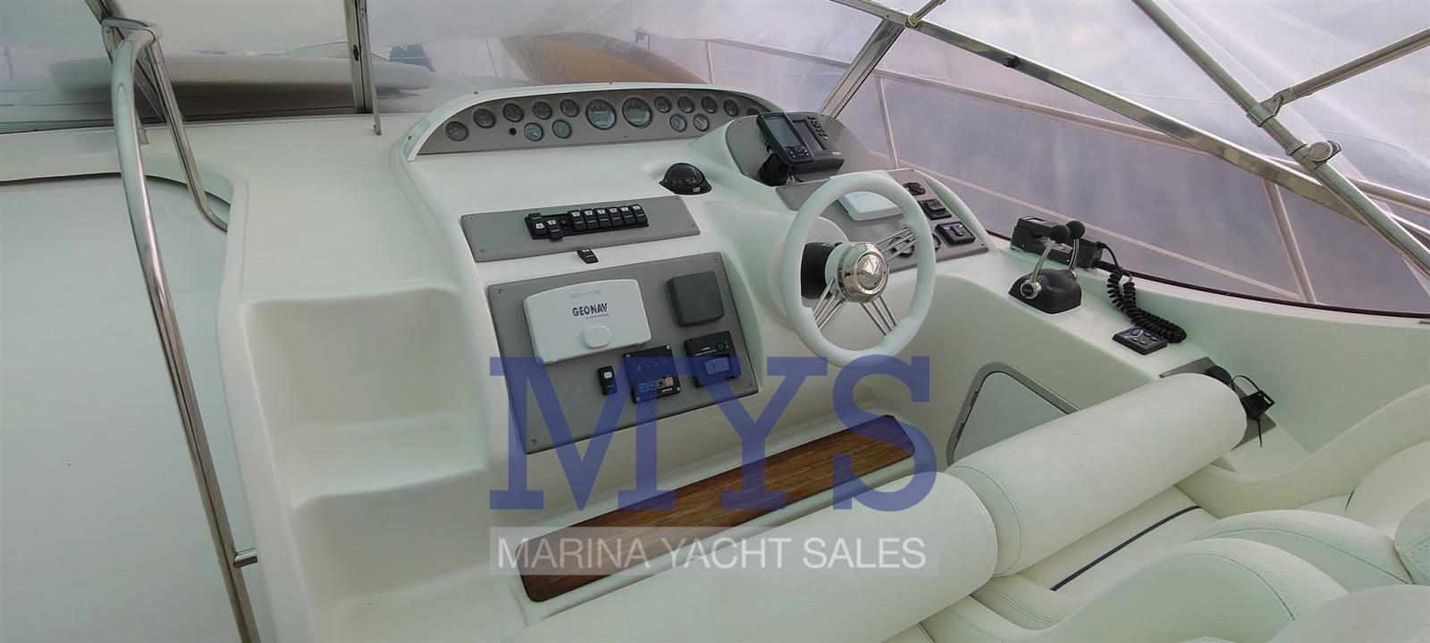 Engine Alarm, Bilge Alarm, Alternator, Electric Engine Compartment Opening, Water pressure pump, Shore power cable, Guard rail, Deck Shower, Hydraulic Flaps, Flaps Indicators, Washbasin in the cockpit, Courtesy Lights, Underwater lights, Gangway (elettrica), Platform, Automatic Bilge Pump, Entry door, Teak Cockpit, Shorepower connector, Rollbar, Electric Windlass, swimming ladder (elettrica), cockpit table, Horn, T-Top.