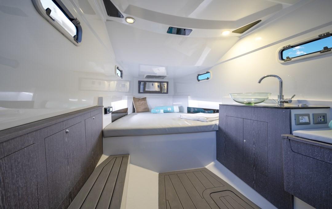 Outside dinette with convertible table Double cabin forward, separate bathroom